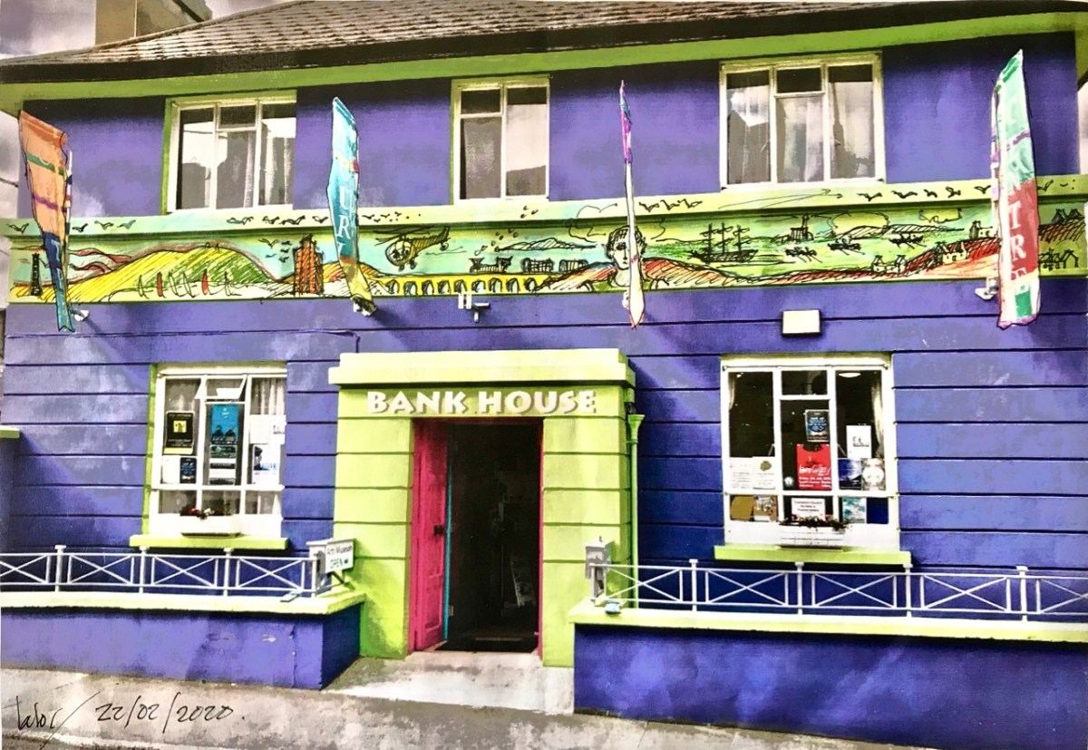 The Museum has a permanent home in Bank House, right in the centre of the village. As you might expect, it was once the local bank but – after closure – it was bought by the community and is currently finding fresh uses. This montage (above) is by Brian Lalor: he and I are imagining the building being livened up by a mural from Brian’s brush. Unfortunately, Covid has put a check on the Museum’s development over the last couple of years. But we are looking forward to getting things going again with a new exhibition for 2022. The photo below shows the Museum interior set up for the 2019 show.
