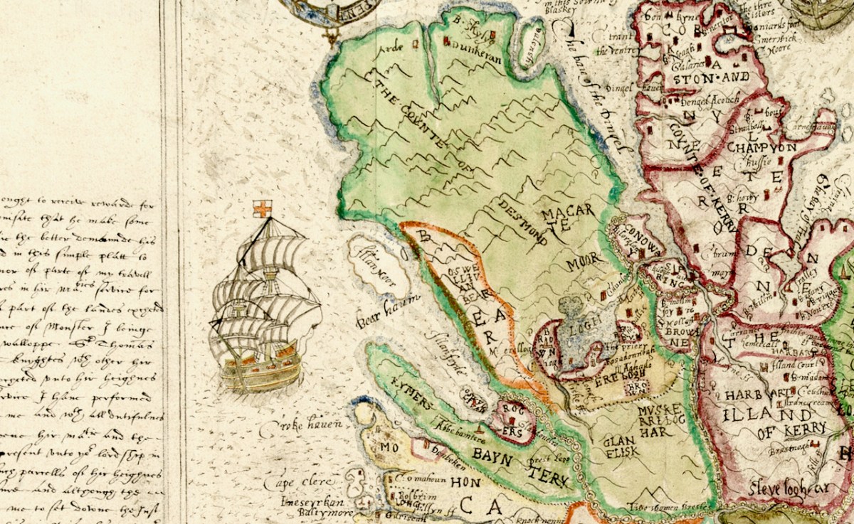 At the head of Dunmanus Bay is Durrus, shown as a community with a steepled church. The small treed estate is Durrus Court, where the 17th century manor house is still standing. The remains of Rossmore Castle can also still be seen. But here’s an interesting thing – there are not one but two castles shown at Dunbeacon! Very mysterious – there is certainly no sign of a second one now, and nothing in the archaeological record.