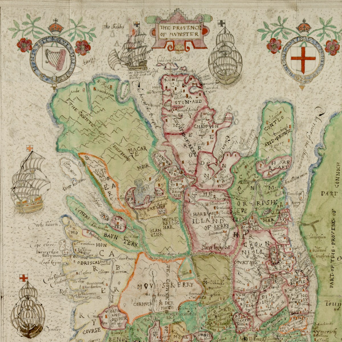 Bear Island is featureless apart from a chapel but Castletown (more properly known as Castletownbere or Castletown-Berehaven) is shown as having a town or village and several substanital houses, a mill, and a church with a steeple. Interestingly, the castle at Dunboy, the siege of which is chronicled in the older map, is not shown at all in this one.