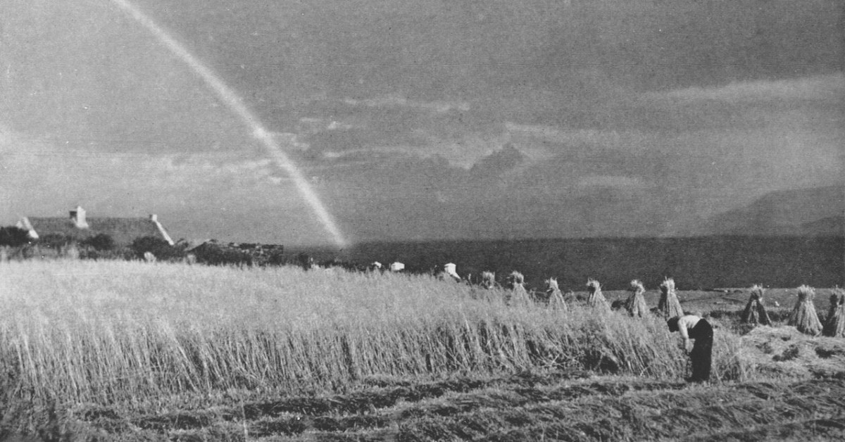 These two photographs show Clare Island during Mason’s visits in the 1930s. Note the castle, above, also included on Brian Cook’s cover painting. That is -of course – the headquarters of Gráinne Mhaol, probably better known as Grace O’Malley (1530 – 1603) – Ireland’s Lady of the Sea. But her story is far too long to tell here: she will have a post of her own in the future! Granuaile Castle overlooks Clew Bay, in Co Mayo.