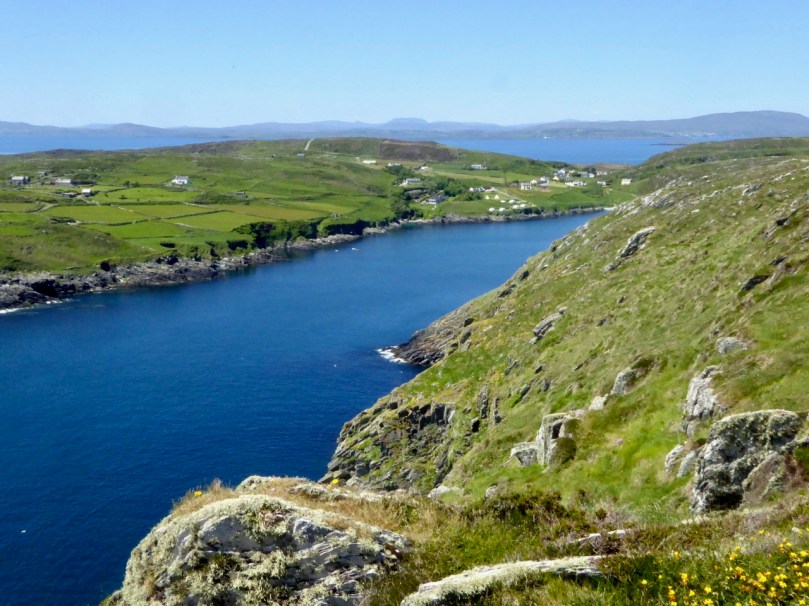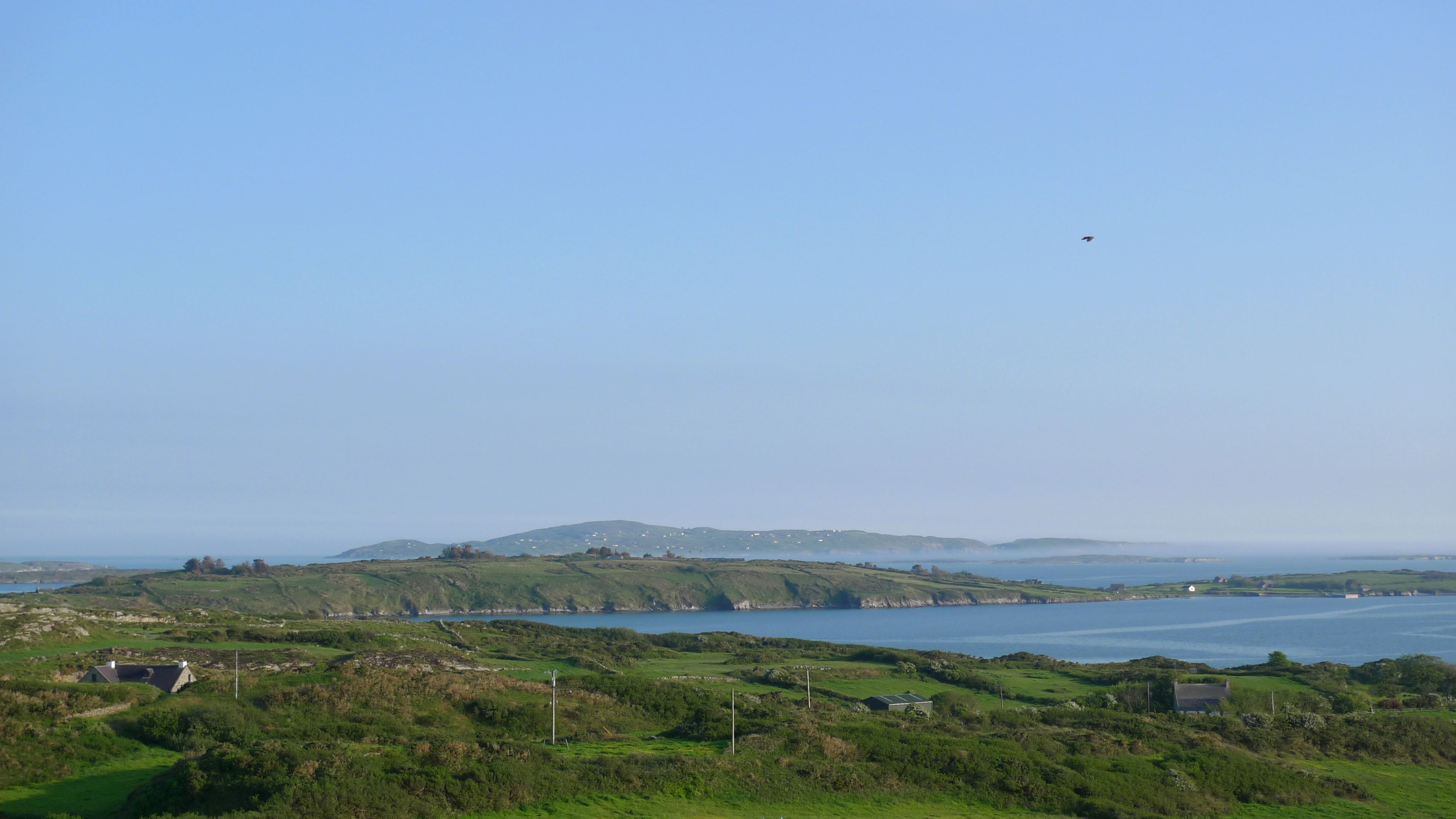 Always in our view from Nead an Iolair are the many islands of Roaringwater Bay: sometimes they are referred to as ‘Carbery’s Hundred Isles’. The largest of them – and the furthest out into the Atlantic – is Cape Clear. From our vantage point in Cappaghglass it sometimes floats on the horizon like a great seal under brooding skies, yet with the clarity of summer skies every hillside cottage can shine like a white jewel. I visited the island for the first time last weekend, drawn to its isolation and history – and by its own Saint – Ciarán, born on this most southerly point of Ireland and preceding Saint Patrick by some generations as the ‘Apostle of Eirinn’.