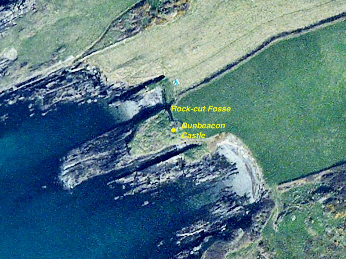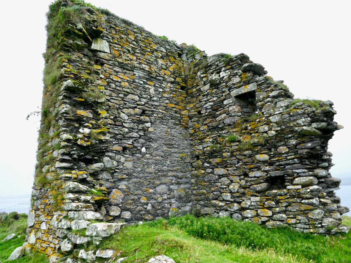 This post will be about the castle itself, as a follow-up to Part 1 about the promontory and historical background. I received some very interesting comments on the name, Dún an Óir, which I interpret as Fort of Gold, and I will write more about that at the end of this post. If you are not familiar with castle architecture, before you start, you might want to browse my castles page and pay attention to how they were built and what the castles of Ivaha generally looked like. Unless otherwise identified, all the photographs in this post were kindly sent to me by Tash, one of our readers. In this one, taken from the sea, the impregnable siting of the castle can be appreciated.