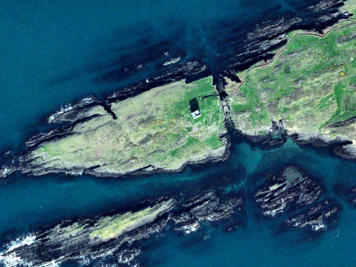 The interpretation of the ruins east of the tower house is more difficult. Erosion has removed the eastermost part of the defences. Two separate walls on the east side of the tower diverge from its orientation; running approximately due east they seem to have formed the north and south walls of a smaller enclosure containing another building. At the west end, the north wall meets a wall (the junction is destroyed) with a gate which abuts the north face of the tower. The robbed jambs of a large gate survive on the east face of the wall and indicates that the gate swung inwards to the west where another enclosure presumably existed. A deep drawbeam is visible in the south jamb. This gate now leads almost directly into a deep ravine. A fair-weather landing stage may have once existed on this side of the island but it would have rarely have been safe to use.