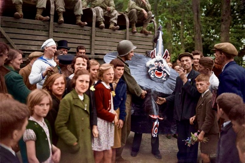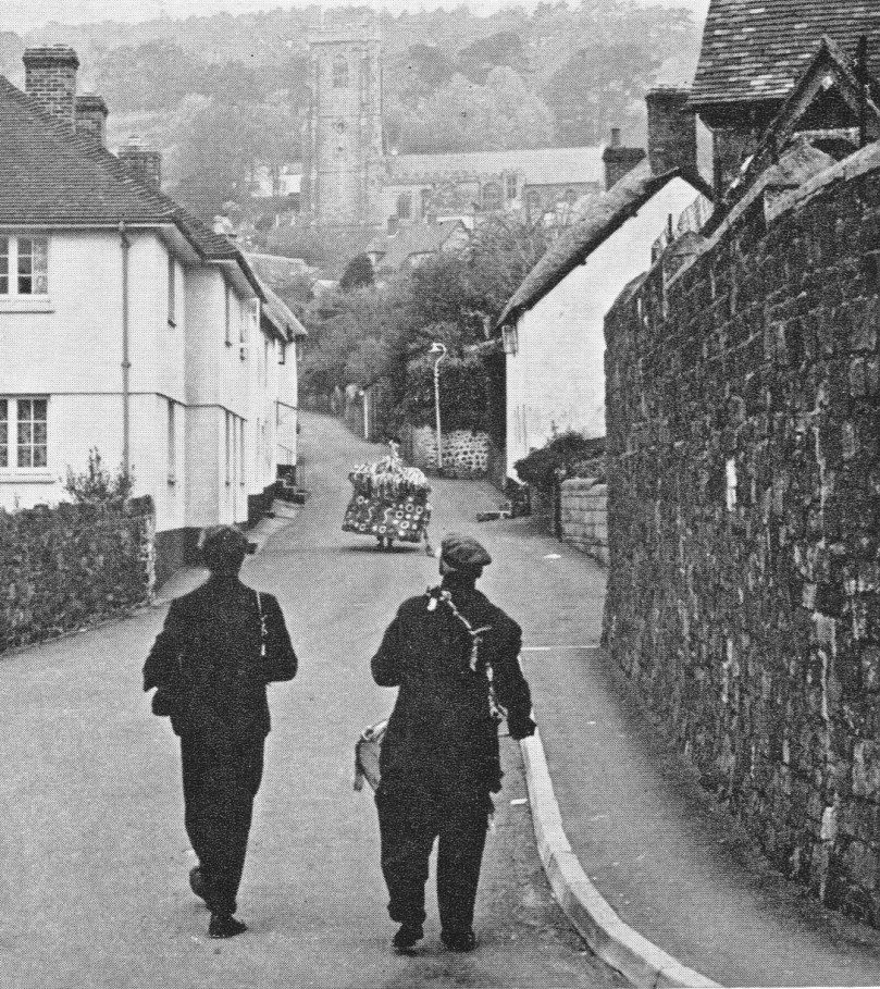 The Padstow Oss has survived through peacetime and wartime. This rare photograph (above) – attributed to Joshua Barret – was taken in 1944, while the early 20th century photograph (below) of the Minehead Oss is my all time favourite of a folk custom: the Oss always has and always will perambulate the town every year, even if no-one is interested in watching it!