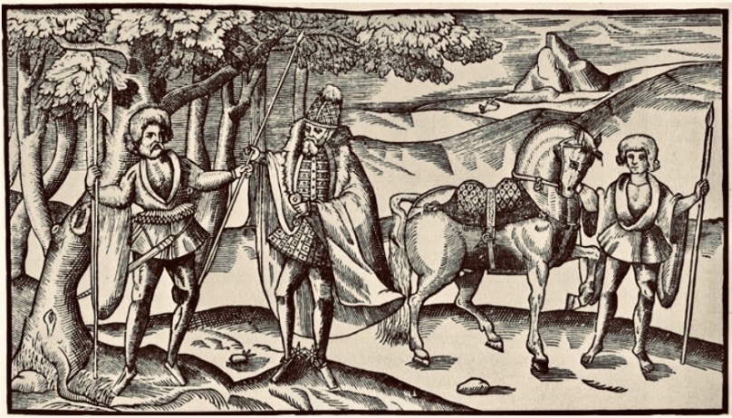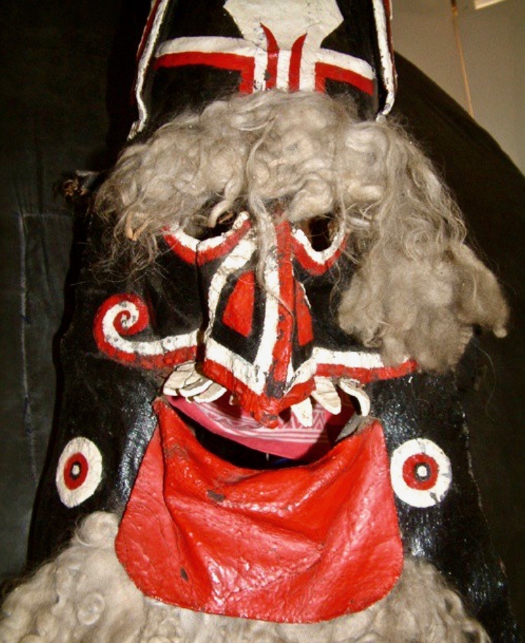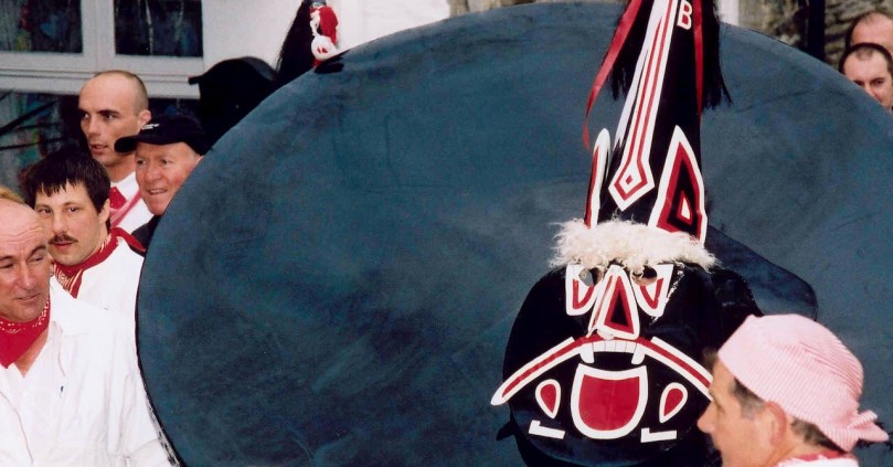 ‘After a reasonable pause we had the delight of seeing twelve young men come forth, accompanied by the same number of young women, the boys dressed much more showily than the girls… To heighten the beauty of the spectacle, out sprung the fool and his wife, the first with some head-dress of skin, a frightful mask, and a goat’s beard descending from it. Though we knew that the big bluff, good-natured countenance of Paudh himself was behind the vizard, we could scarcely refrain from taking flight, not being able any more than other children to look on an ugly mask without extreme terror. His wife (little Tome Blanche, the tailor) was in an orange-tawny gown, flaming handkerchief and mob-cap, and had a tanned, ugly female mask, fitting pretty close to her face. Paudh’s first salute to his friends was a yell, a charge in various directions, and a general thrashing of the crowd with his pea-furnished bladder suspended from a long stick. Mrs Clown had a broom, and used it to some purpose when she found her friends disposed to crowd her.’