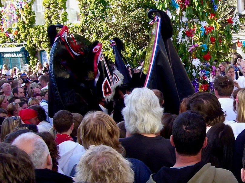 In the west of England, which has always had close links with Ireland in terms of language, culture and industry – the month of May has long been celebrated with a strong focus on the ‘Hobby Horse’, a phenomenon which bridges the worlds of superstition, spectacle and folklore. In two places – Padstow in Cornwall and Minehead in Somerset – Hobby Horse (or, colloquially ‘Obby Oss’) festivals are huge events – usually. In 2020, sadly, both had to be cancelled due to Covid19 restrictions: probably the first time in hundreds of years that they have not taken place. The Minehead Oss has a recorded history that goes back to at least 1465, while in Padstow they will tell you that the Obby Oss has been revered forever on the First of May with never a break.