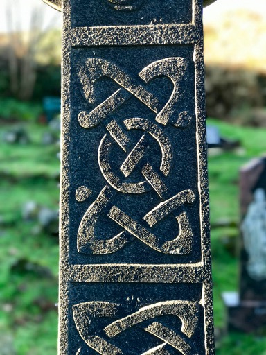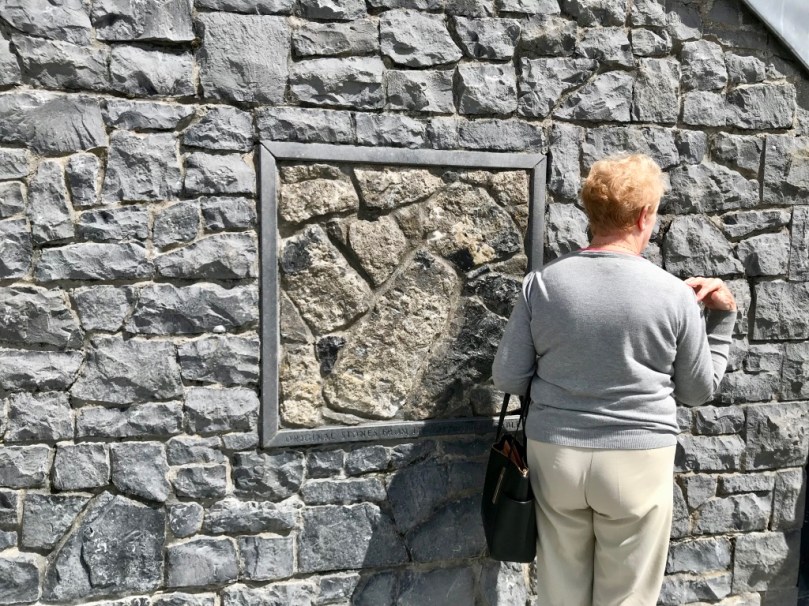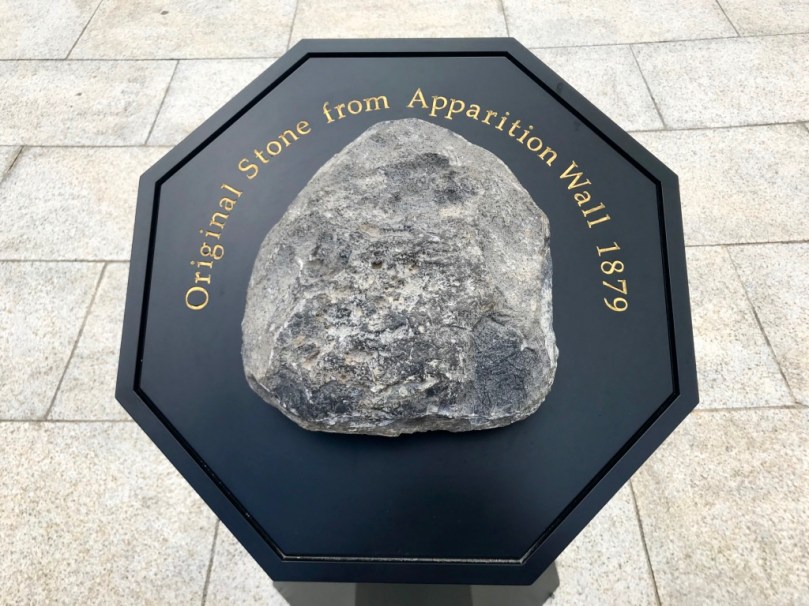 This is original stonework from the gable wall to the Parish Church: the lower picture is a panel built in to the modern Apparition Chapel wall. The statements made by the 15 witnesses who saw the vision at the wall in 1879 are fully documented here – an official Commission of Enquiry was held by the Catholic Church in that same year and concluded . . . the words of the witnesses were trustworthy and satisfactory . . . a further investigation in 1936 interviewed the then surviving witnesses, who corroborated what they had seen. Mary Byrne, who was 29 at the time of the apparition and 86 during the second enquiry said . . . I am clear about everything I have said and I make this statement knowing I am going before my God . . . She died shortly afterwards. John Curry, the youngest witness, was 5 in 1879. The child said . . . he saw images, beautiful images, the Blessed Virgin and St Joseph. He could state no more than that he saw the fine images and the light, and heard the people talk of them, and stood upon the wall to see them . . . He confirmed his memories when interviewed in new York for the 1936 enquiry.