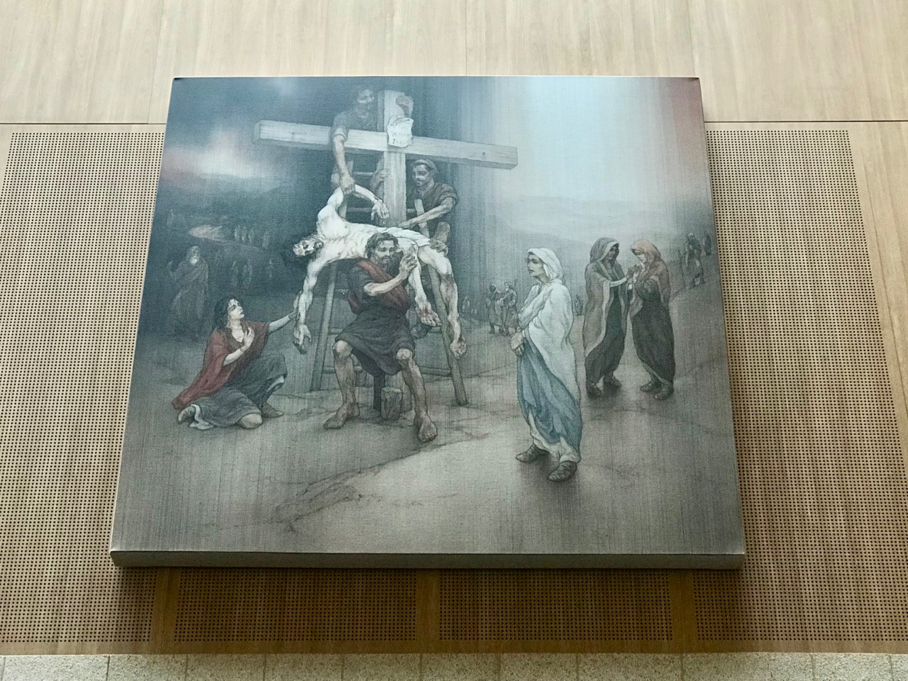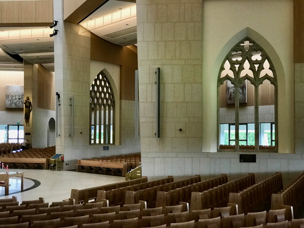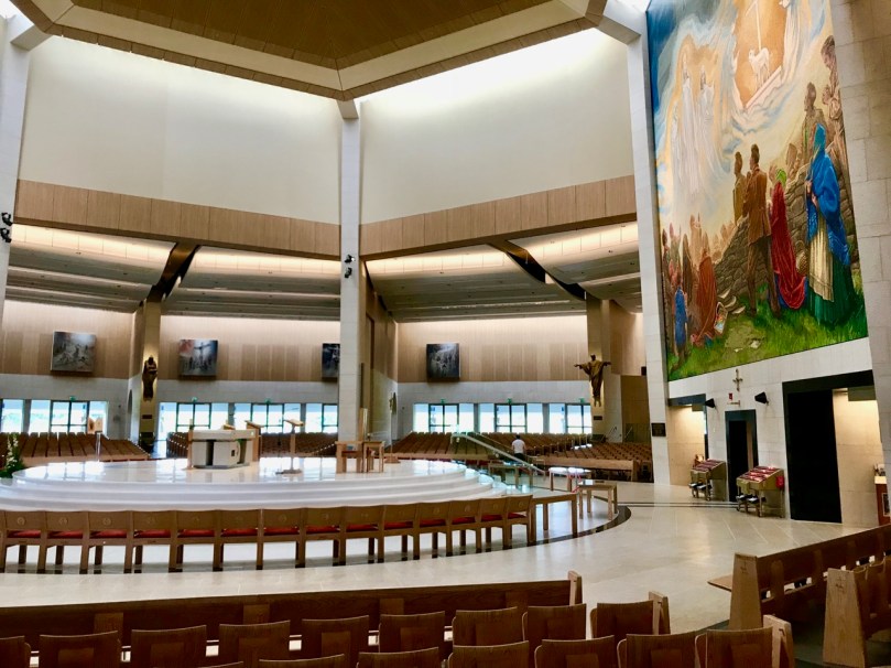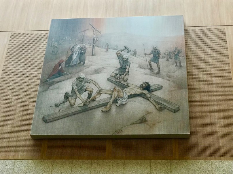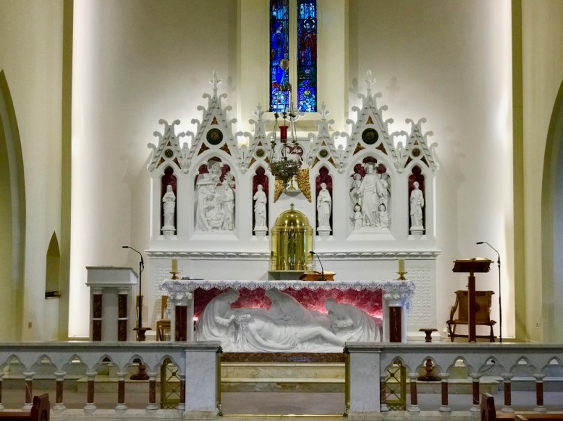 Over a million people a year come to Knock, in search of faith, enlightenment, cures perhaps: or just out of curiosity. It is a place with a great sense of purpose – and long may it continue. As a (now retired) church architect I was distinctly struck by the enormous Basilica which was constructed initially in the 1970s and which has been refurbished very recently. It is spectacular in its size and scale and is fittingly furnished with powerful works of art. In particular I was impressed by the large, harrowing, painted Stations of the Cross, the work of Mayo artist, Ger Sweeney.
