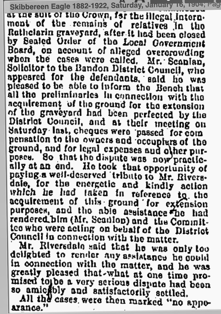 It was all reported with gusto in the Examiner and the Southern Star (which I accessed through that indispensable resource, the Irish Newspaper Archives). The facts of the matter were that Canon Powell, the Church of Ireland Rector, wished to close the graveyard to further burials, claiming that there was a putrid smell and that people came and buried their deceased family members ‘willy nilly’ with little regard for the depth of the grave or the previous occupants. He was supported by Dr Shorten, a medical man and one of his parishioners, who conducted an inspection.