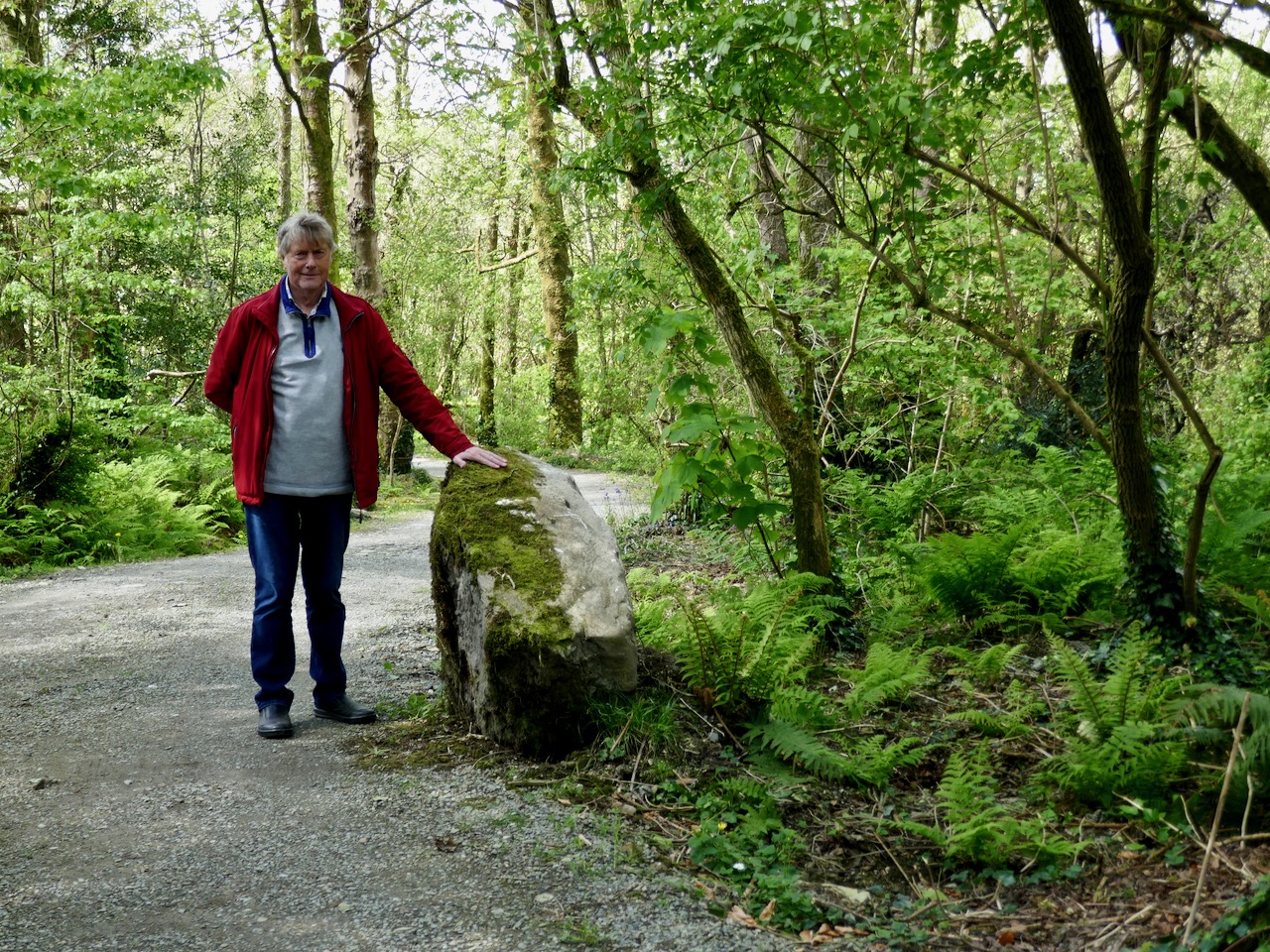 There’s a concentration of prehistoric rock art around Castletownshend and I am currently writing a paper about that for the next issue of the Journal of the Skibbereen and District Historical Society. There are seven individual pieces of rock art: as part of the research I recently visited the one stone I hadn’t seen yet. Fortunately, we had the company and assistance of Conor Buckley of Gormú Adventures (been on one of his marvellous walks yet? If not, try this one, or this one or this one.) who, as a native of the area, knows everyone and introduced us to the landowner, the genial Bill O’Driscoll.