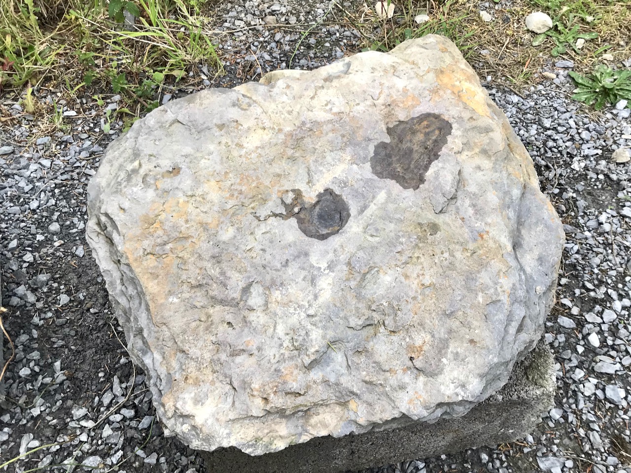 Regular readers know of our involvement with Prehistoric Rock Art – Neolithic or Bronze Age carvings on open air boulders and outcrops. The cupmark is the basic motif of all Irish Rock Art – a semi-spherical cup-shaped hollow (see more about Rock Art here and here and specifically about cupmarks here). Robert has an amazing eye for slight differences in rock surfaces and has developed a habit of examining every stone we come across for cupmarks. This time he struck gold! At least four cupmarks on the back of a stone along one of the trails.