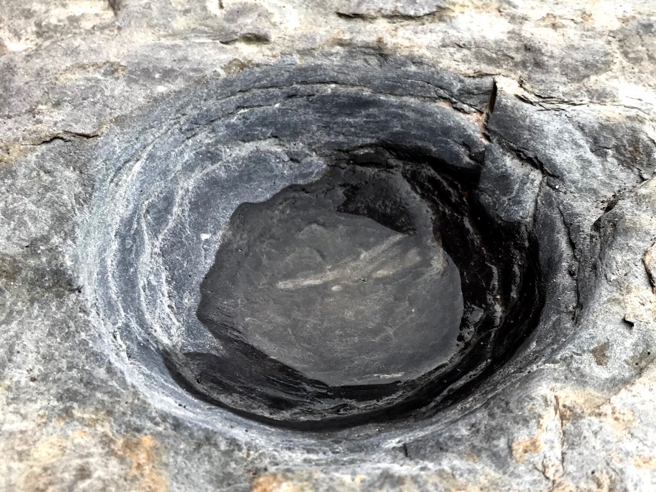 Once the cupmark was as deep and round as he wished, his next step was to smoothen the inside. We have noted this as a feature of cupmarks – when you run your fingers around the inside they do feel more smooth than rough. In fact, a rough surface is often an indication that the ‘cupmark’ is actually a naturally occurring geological anomaly or solution pitting rather than the product of human labour.