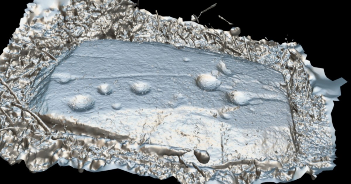 You can view the render in what is called Matcap, which creates it in a metallic view (above and below). On a grey day with no shadows, and still lots of mud on the stone, none of this was obvious to the naked eye. There is a possibility that these new elements, rather than being carved, are natural contours in the rock itself. We haven’t had time yet to go back and check this out more carefully, but we will have to do so – and update this post! If indeed the lines turn out to be carved, that fact will elevate the rock from a Cupmarked Stone to Rock Art. Watch this space.
