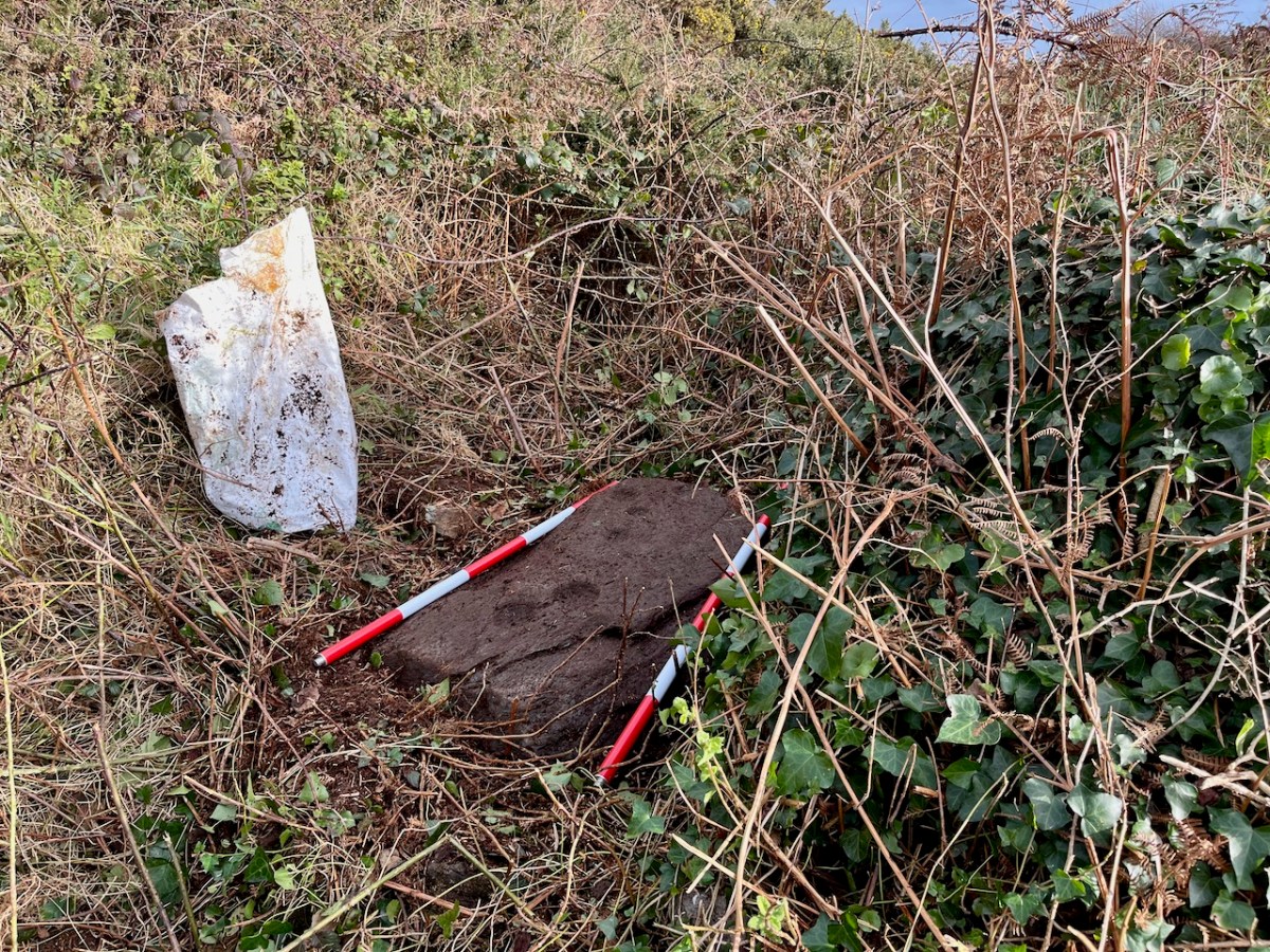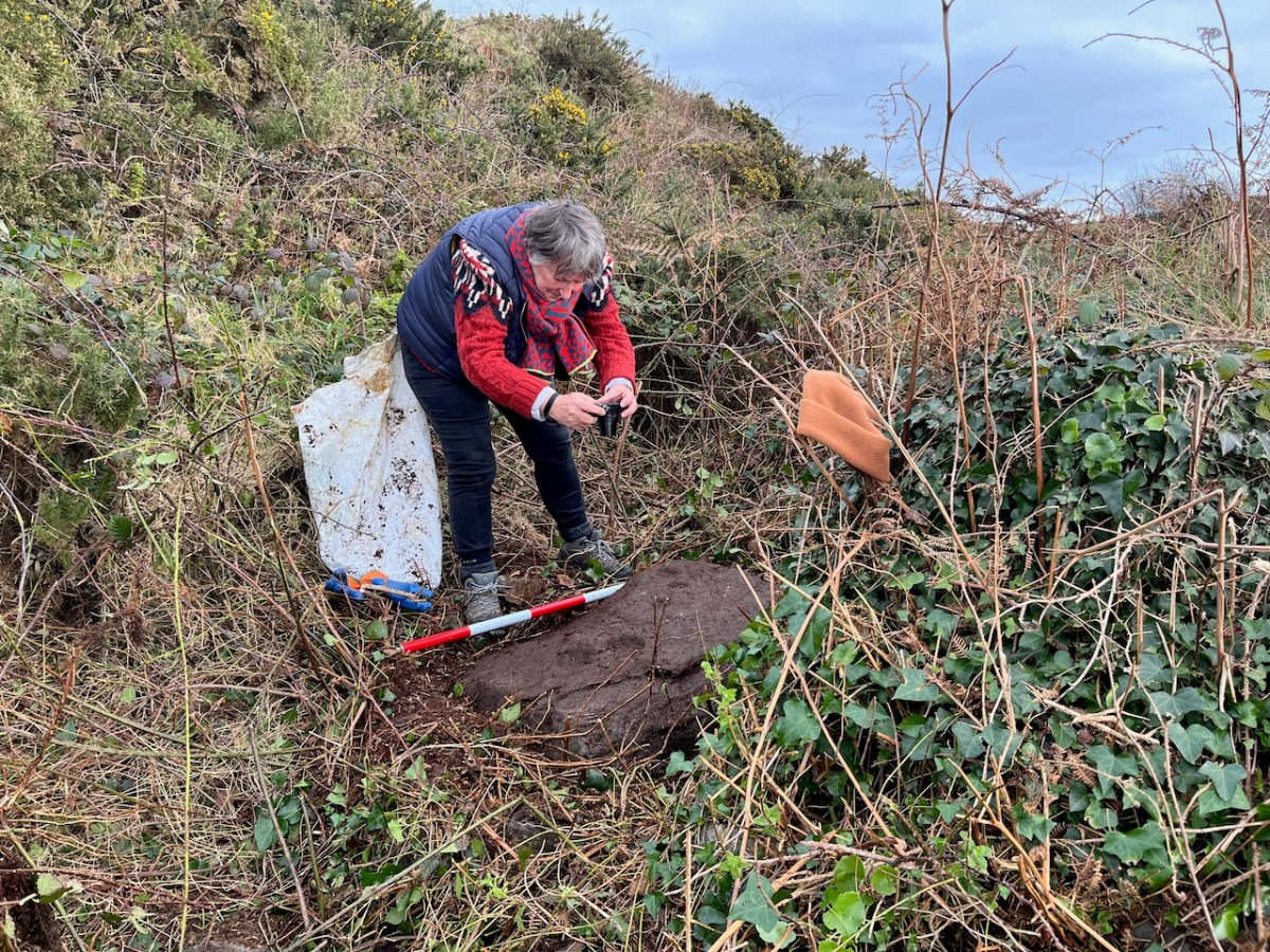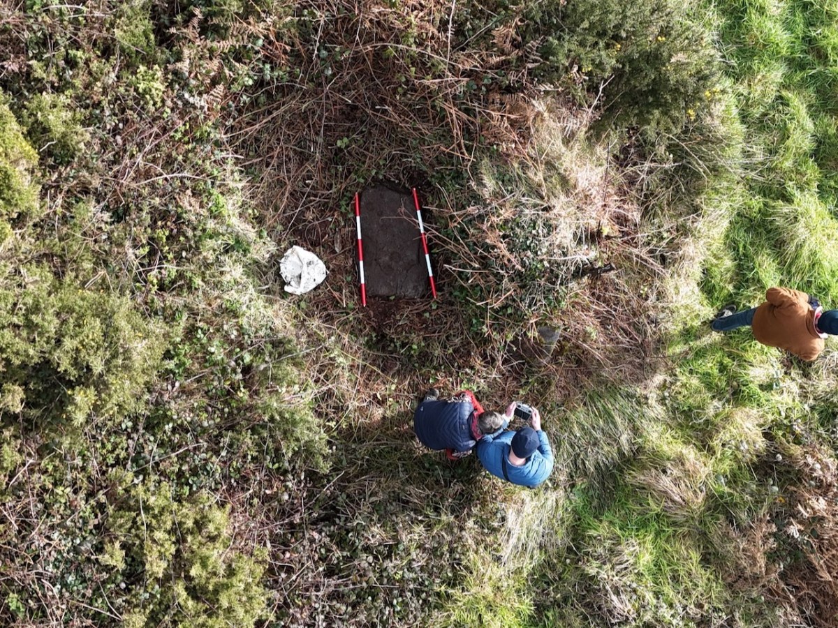 Conor had his drone with him – a new experience for us! He took photos and videos of the stone in its general location, capturing me doing the photogrammetry and also a good indication of the amount of undergrowth that had to be cleared out of the way before the rock came into view. (Thank you, Bill!)
