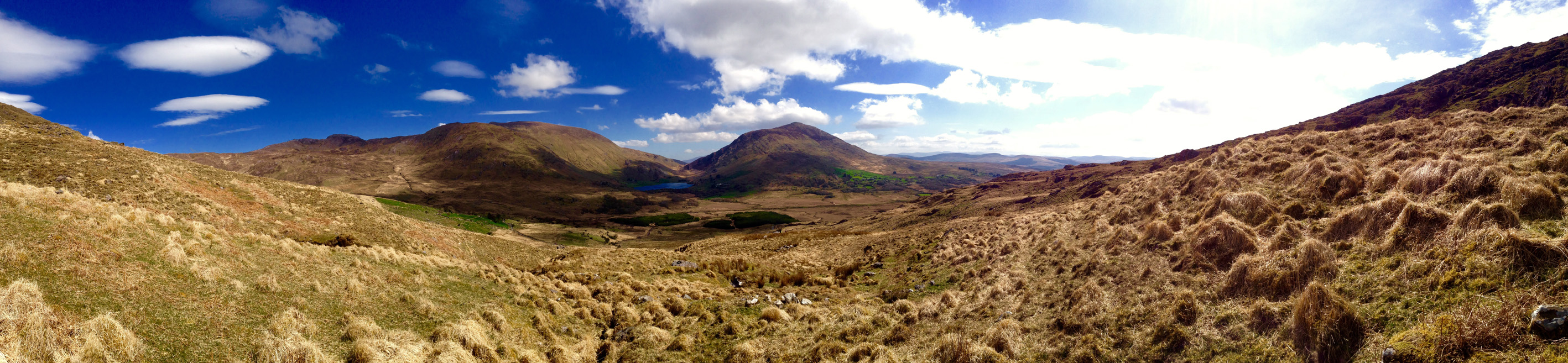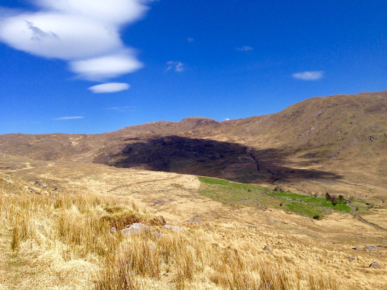 Irish prehistoric rock art likely dates from the Neolithic, about 5,000 years ago. We’ve written extensively about rock art (and indeed about Derrynablaha) – see all our posts on this special menu page. There are significant concentrations in Kerry, including 49 pieces identified so far in the adjoining townlands of Derrynablaha and Derreeny, in the middle of the Iveragh Peninsula. To get there, turn north from the Blackwater Bridge and head for the Ballaghbeama Gap.