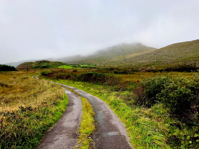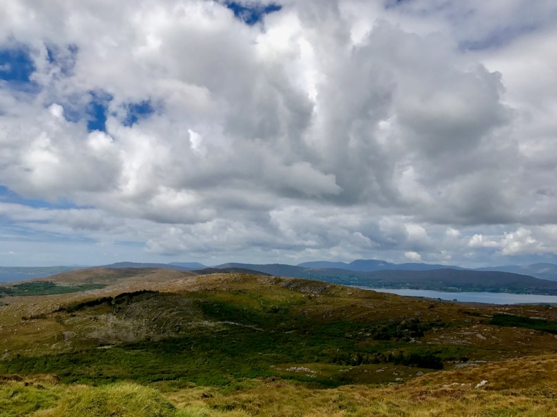 In the latter part of this summer we have explored the road in all weathers, and recorded the many moods of the mountain. Reaching the summit last week, we had a search for the Archangel’s footprint. I’m convinced we found it, but we couldn’t see the lake with its magical islands which – according to the legends ‘…float about up and down, east and north and south; but every Lady-day they come floating to the western point, and there they lie fixed under the crag that holds the track of the Angel’s foot…’ (John Abraham Jagoe, Vicar of Cape Clear – Church of Ireland Magazine 1826)