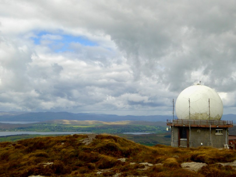 The climb to the summit of Mount Gabriel is always rewarding, with panoramic views to all points of the compass. Lower Picture: the Air Traffic Control Authority’s installations atop the mountain add an odd drama to the landscape