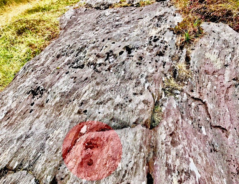 The peak of Mount Gabriel is strewn with rocks, any of which might contain the Archangel’s footprint. Upper – the view to the islands of Roaringwater Bay. Lower – could this be where he touched down? A definitely footprint shaped impression on this rock – highlighted on the photo in red