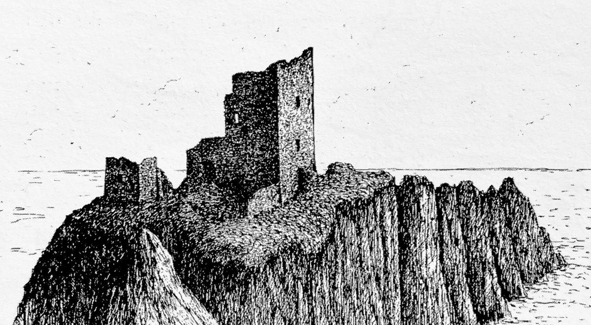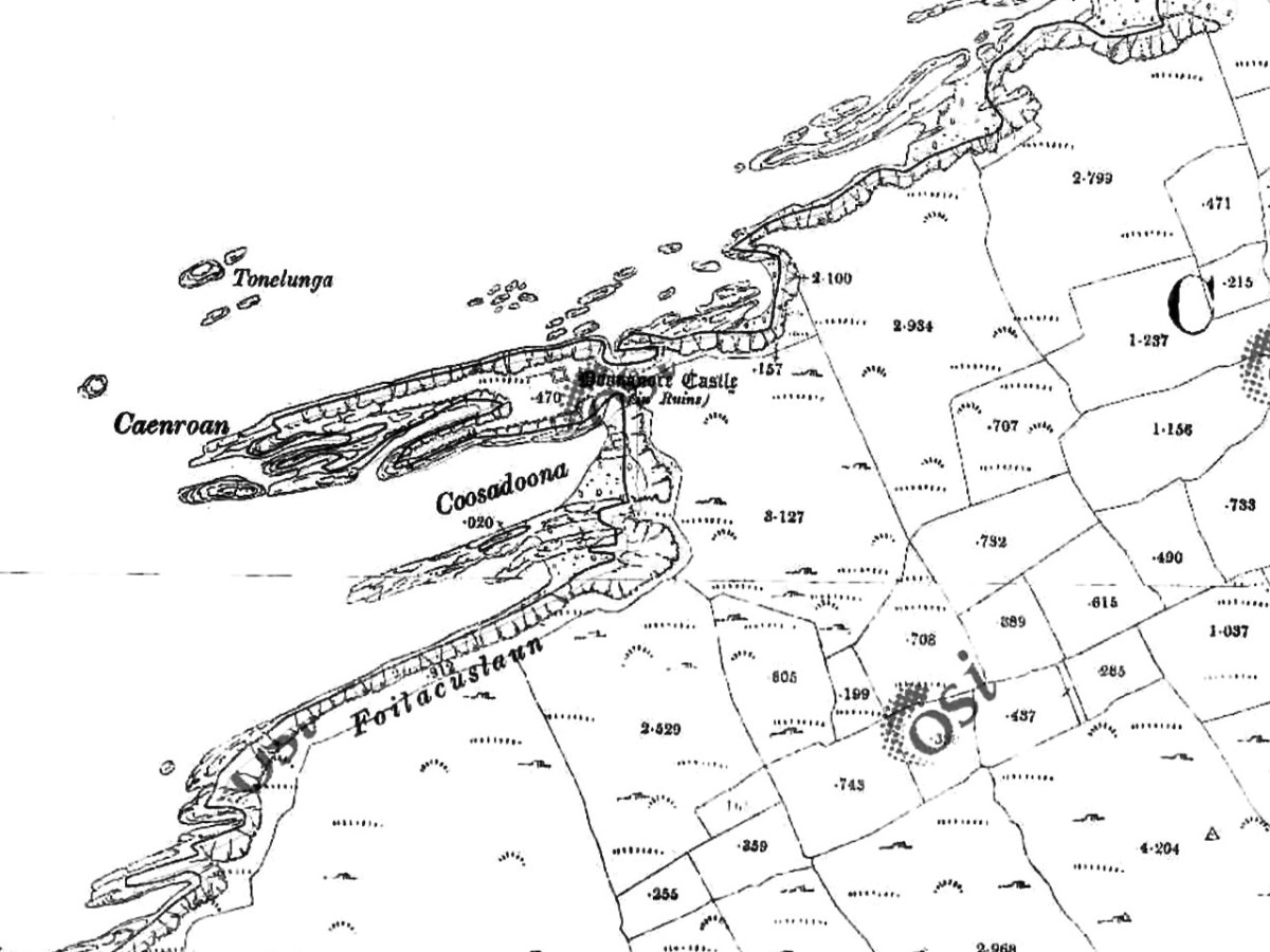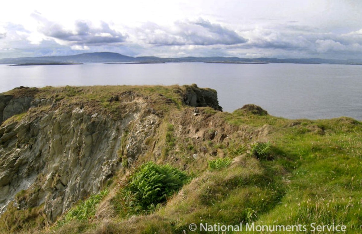The continuous and well-preserved north wall of the bawn terminates to the west with a return that runs a short distance north before being broken away. This is the inner face, a turret with gunloops which defended the bawn. The curved outer wall enfiladed the mainland with three widely splayed gunloops.