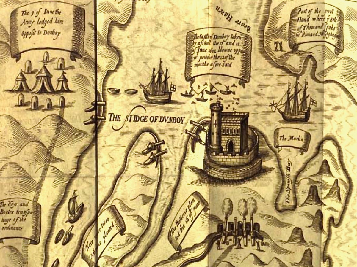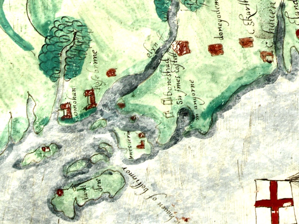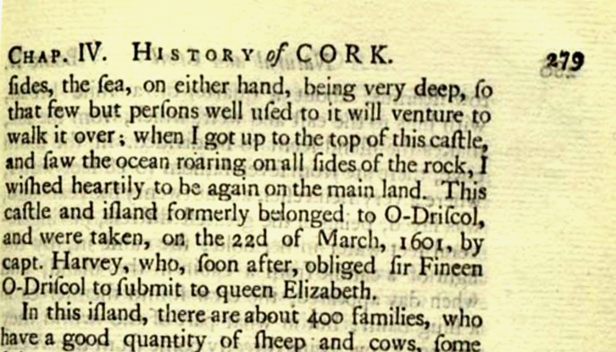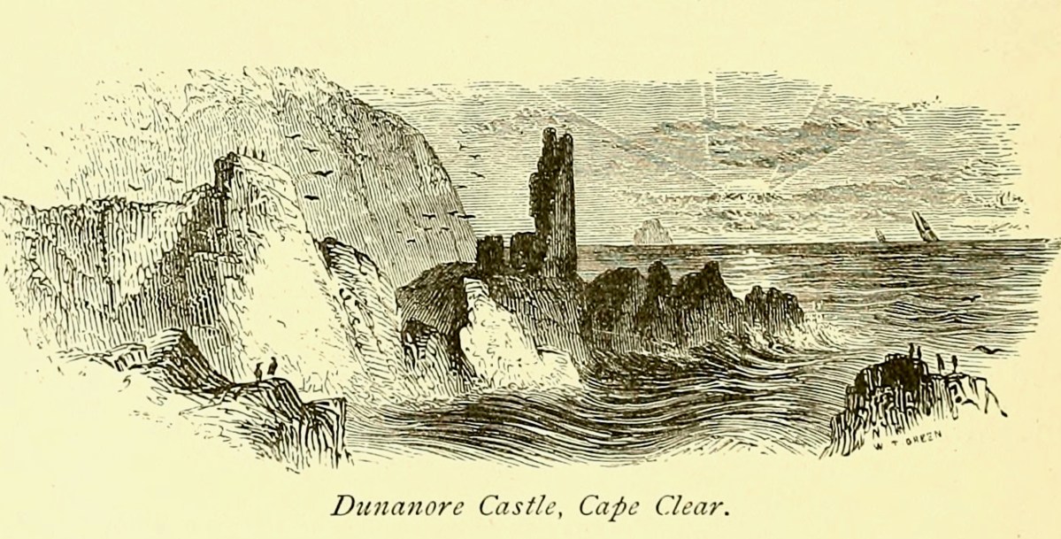 Sarah Kerr positions Dún an Óir in a network of O’Driscoll castles that together worked to control the resources of Roaringwater Bay, to levy fishery dues, monitor trade, and defend territory when necessary. Within this network, the highest status tower, and probably centre of administration was Dún na Séad (Baltimore). The highly visible nature of all these castles, some on promontories and all visible from the sea, were ‘manifestations of authority, wealth and status.’ She posits that:
