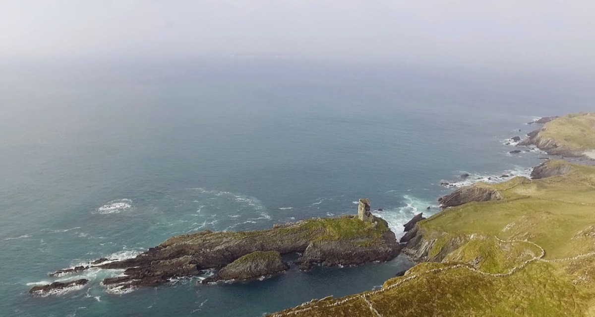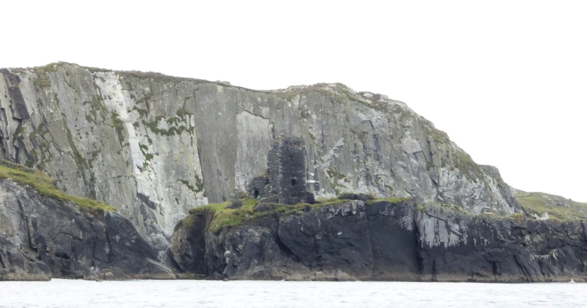 This post will be about the castle itself, as a follow-up to Part 1 about the promontory and historical background. I received some very interesting comments on the name, Dún an Óir, which I interpret as Fort of Gold, and I will write more about that at the end of this post. If you are not familiar with castle architecture, before you start, you might want to browse my castles page and pay attention to how they were built and what the castles of Ivaha generally looked like. Unless otherwise identified, all the photographs in this post were kindly sent to me by Tash, one of our readers. In this one, taken from the sea, the impregnable siting of the castle can be appreciated.