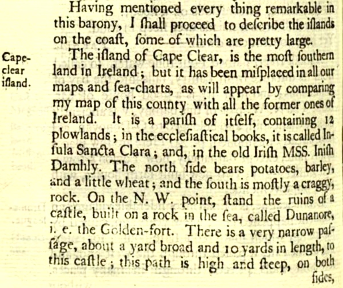 In response to my first post I had several suggestions for alternate titles on Facebook. Ruamann Ua Ríagáin proposed an alternate interpretation as Dún an Ár, or Fort of the Slaughter. There are no indications that there was any tradition of cattle-slaughtering at this site, nor any record of a massacre. However, it remains a possible interpretation. Another reader, Tom Driscoll found another Dún an Óir which was assumed to come from Dún an Ochair, meaning Fort on the Brink/ Cliff Edge. Certainly apt for this location. Finally, note the long comment on Part 1 by OVERSEASGREATGRANNY who is trying to trace similarly named forts and relate them to Irish history – quite fascinating.