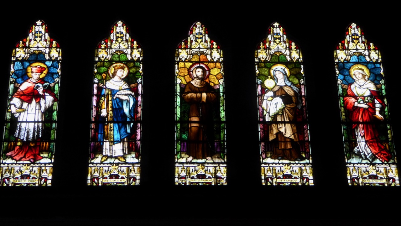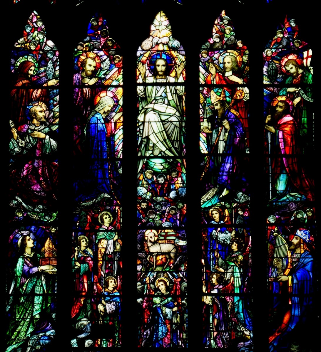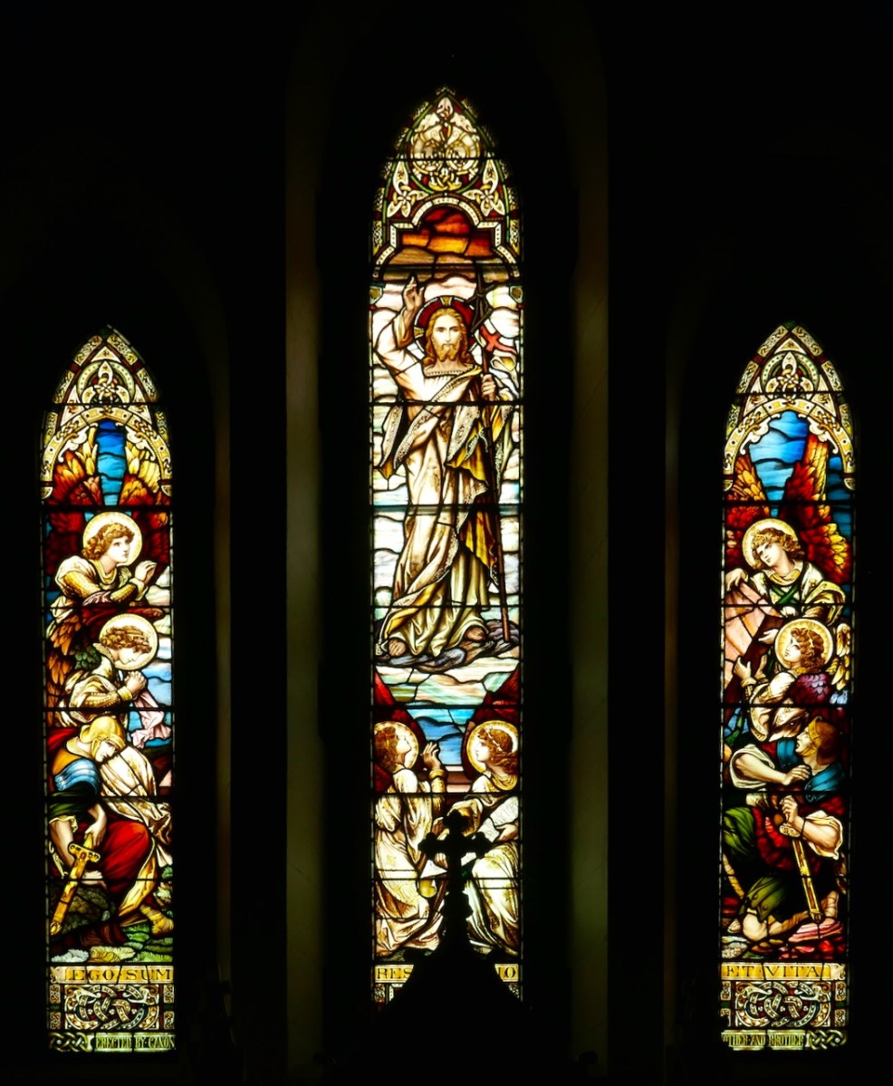 My final point for this post about St Brigid is the matter of where she is buried. Most authorities give this as Downpatrick, where she is laid to rest alongside Patrick and Columcille. However, a medieval legend grew that she went to Glastonbury in old age and died there. That is why she is venerated in Britain as well as in Ireland – the top photograph in this post is from the St Brigid window in Exeter Cathedral. Here’s the full window, in which she is flanked, for some reason, by St Luke and St John busily writing their gospels.