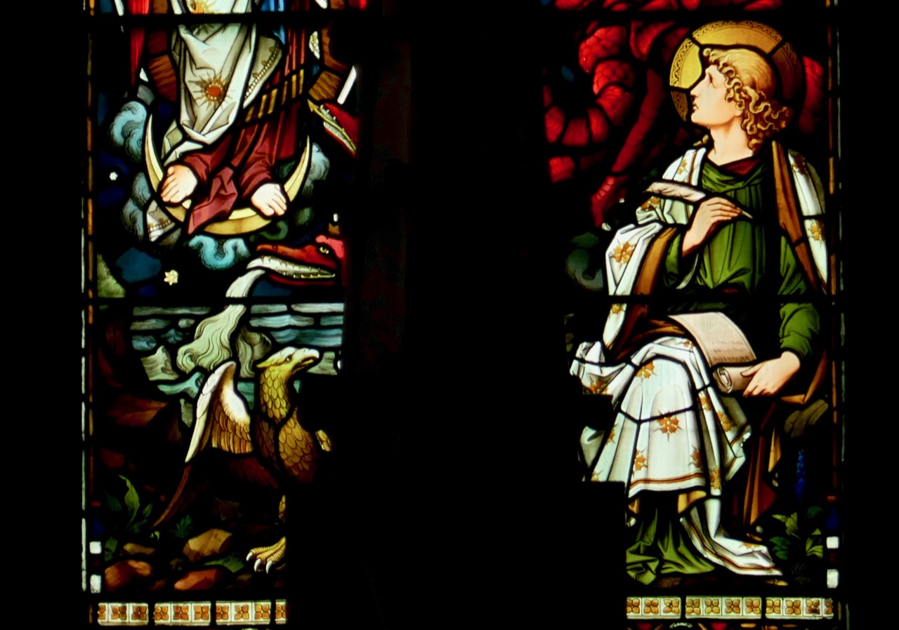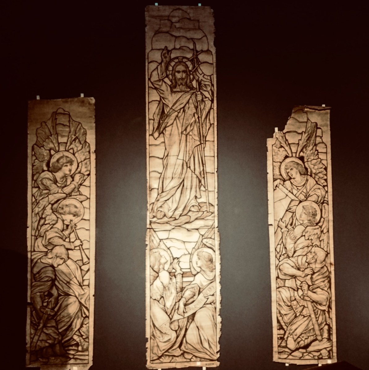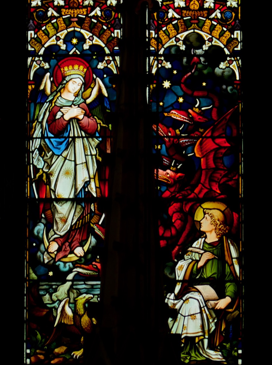 My final point for this post about St Brigid is the matter of where she is buried. Most authorities give this as Downpatrick, where she is laid to rest alongside Patrick and Columcille. However, a medieval legend grew that she went to Glastonbury in old age and died there. That is why she is venerated in Britain as well as in Ireland – the top photograph in this post is from the St Brigid window in Exeter Cathedral. Here’s the full window, in which she is flanked, for some reason, by St Luke and St John busily writing their gospels.