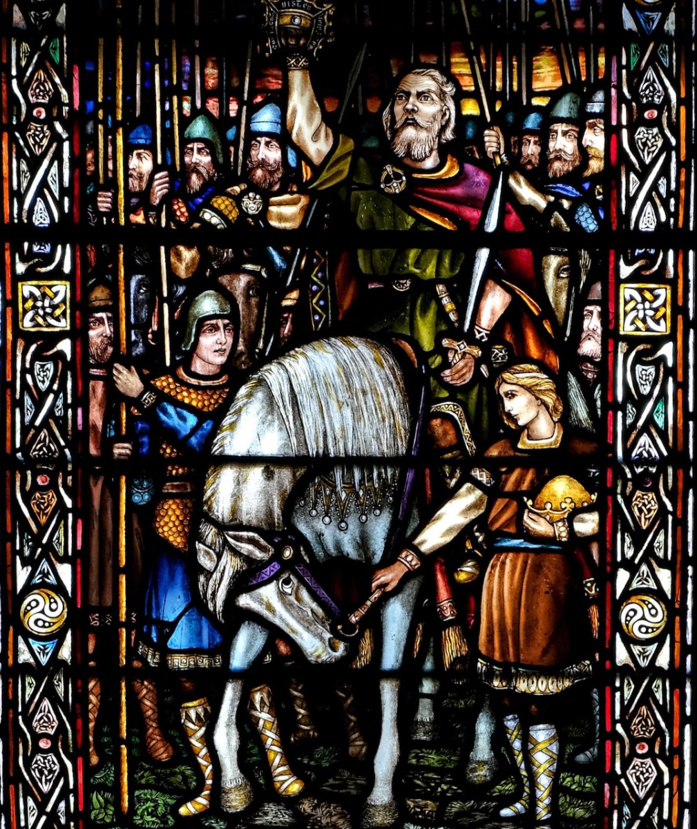 Brigit went to Bishop Mel, that he might come and mark out her city for her. When they came thereafter to the place in which Kildare stands to-day, that was the time that Ailill, son of Dunlang, chanced to be coming, with a hundred horseloads of peeled rods, over the midst of Kildare. Then maidens came from Brigit to ask for some of the rods, and refusal was given to them. The horses were (straightway) struck down under their horseloads to the ground. Then stakes and wattles were taken from them, and they arose not until Ailill had offered the hundred horseloads to Brigit. And therewith was built Saint Brigit’s great house in Kildare, and it is Ailill that fed the wrights and paid them their wages. So Brigit left (as a blessing) that the kingship of Leinster should be till doomsday from Ailill, son of Dunlang.