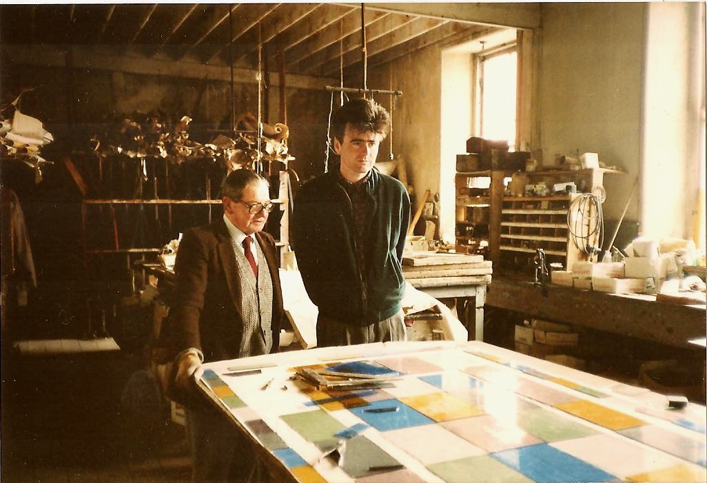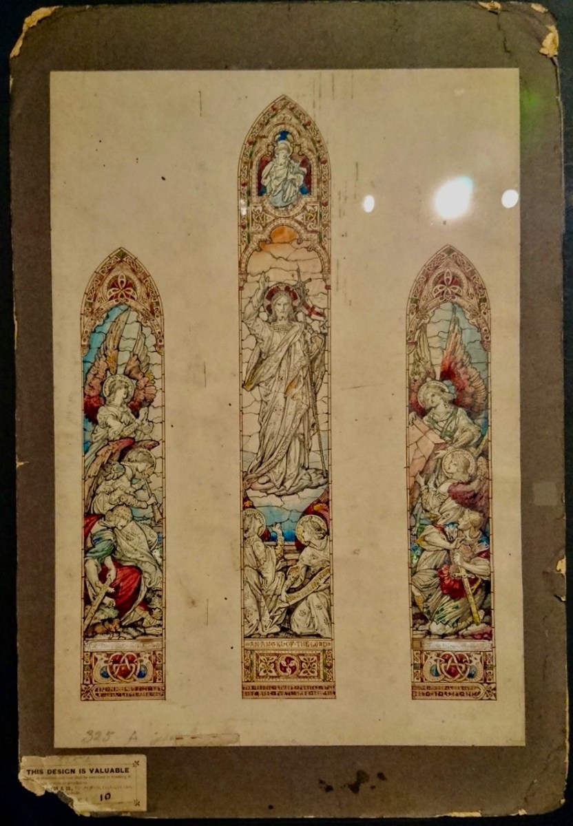 Detail from the Brigid Window in Carrickmacross – she’s consulting with her architects