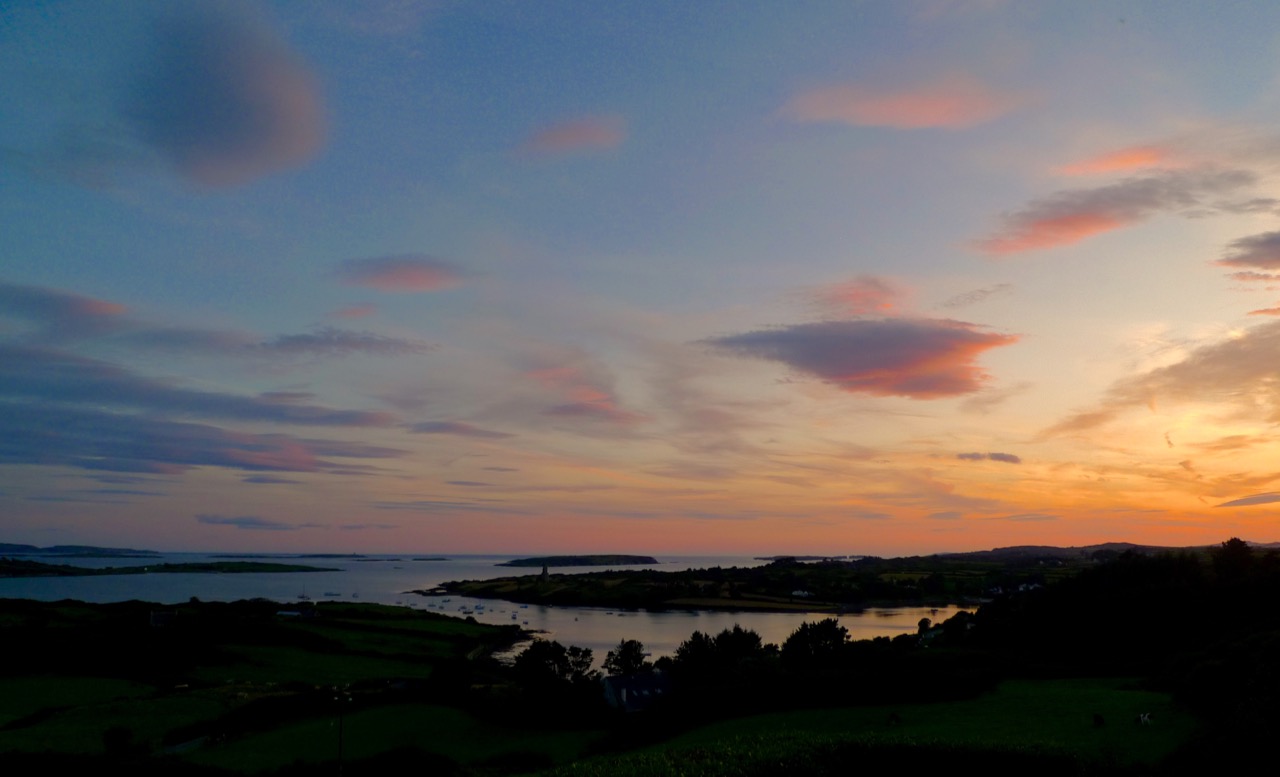 . . . Here was a scene that is hard to equal anywhere else in Ireland. Ahead of us lay the country of O’Sullivan Beara. Away in the distance lay Beara island like a sleeping monster resting on the sea, protected on the northern side by the massive bulk of Hungry Hill, and farther west by a ring of mountains whose western slopes dip down into the Atlantic Ocean. Behind us we looked across Bantry Bay at Bantry away in the distance sheltered by the bulk of Whiddy island. Nearer to us was Glengariff with its myriad of islets and heavily wooded hinterland, cosy and comfortable looking, secure in the shelter of its encircling mountains. On a cold November day in the weak wintry sunshine people do not stay long admiring scenery from such a dank vantage point as Coolieragh, and so we continued our journey westwards along by Adrigole, close to the Healy Pass, skirting the foot of Hungry Hill with its silver streak waterfalls and finally we arrived at the capital of the Beara Peninsula, Castletownbere . . .