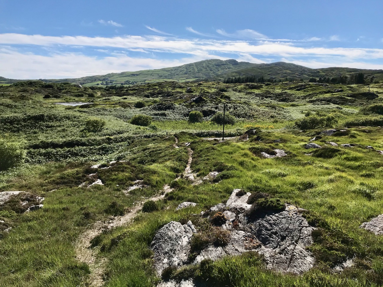 The mountain trail section ends on the small boreen running to the west of Knockaphuca, but the waymarkers will lead you back to the starting point, and there are still views up to the summit to enjoy, along with some landscape features on the way to continue to stimulate the senses.