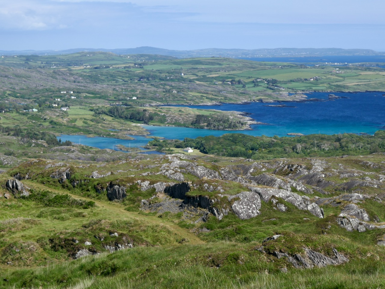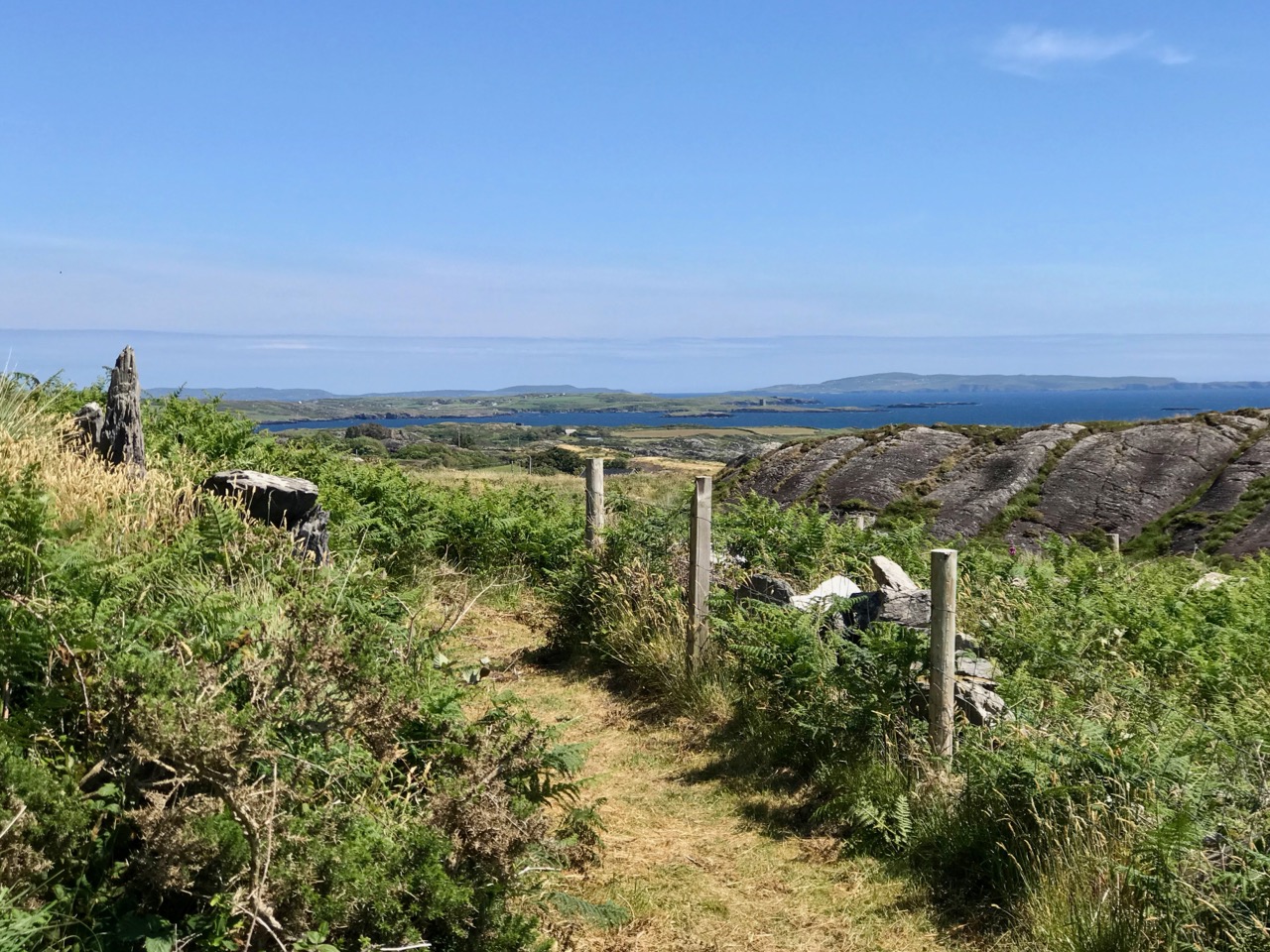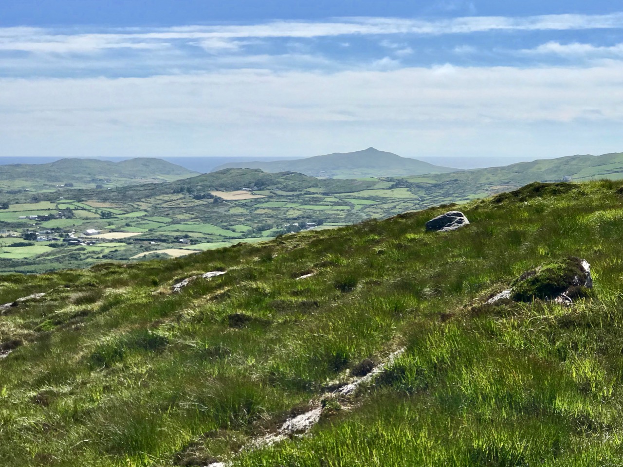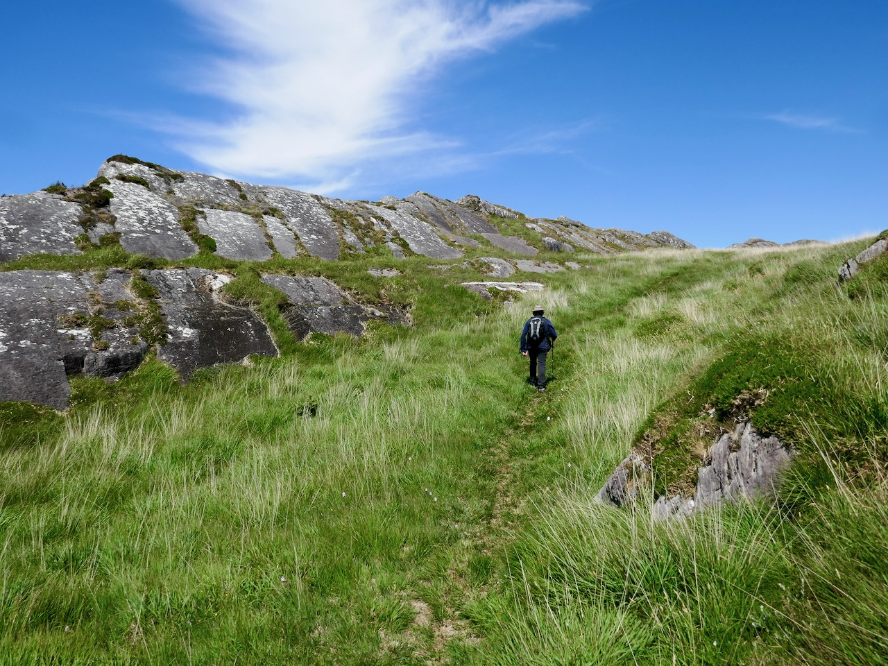 After a while the path turns to the east and follows narrow, grassy glens bordered by majestic, serpent-like outcrops. It’s here that the views begin to open out, particularly to the south. Always you think that there couldn’t be a finer prospect over the Mizen and across the islands of Roaringwater Bay, and always – as you climb higher – you are surprised by the next, which is even better.
