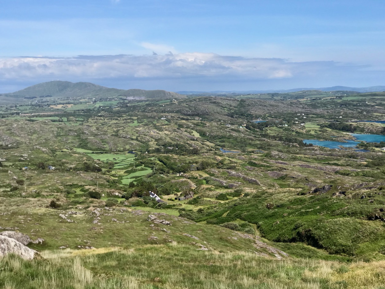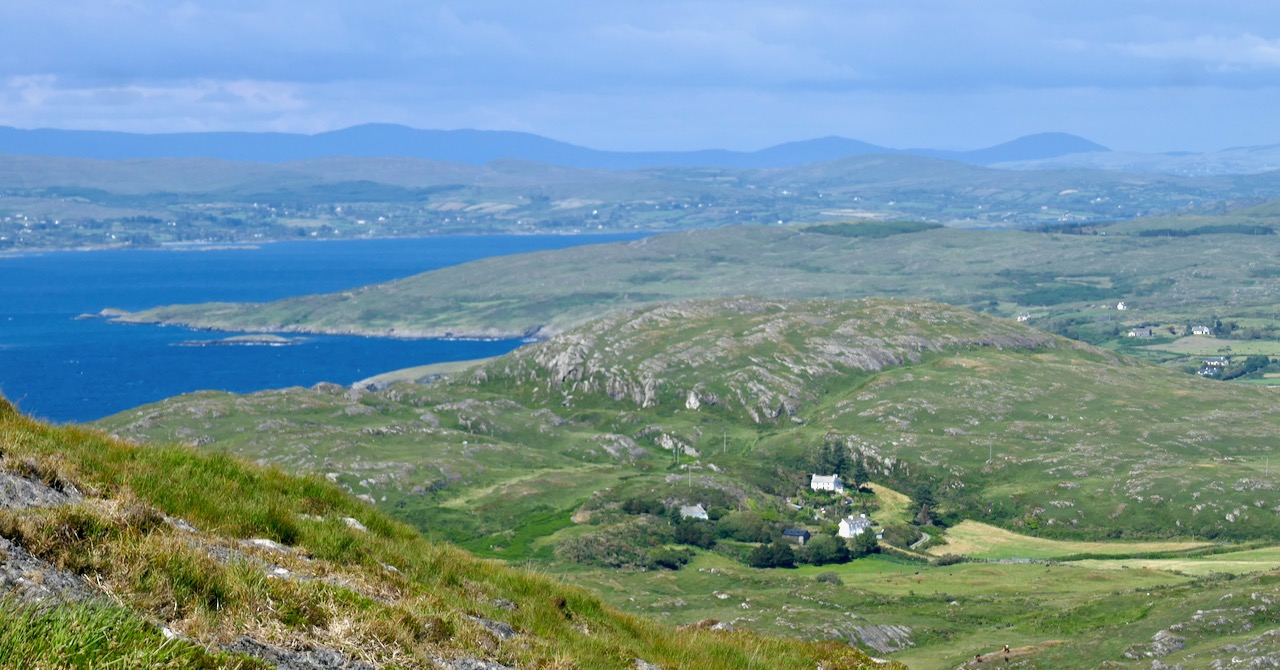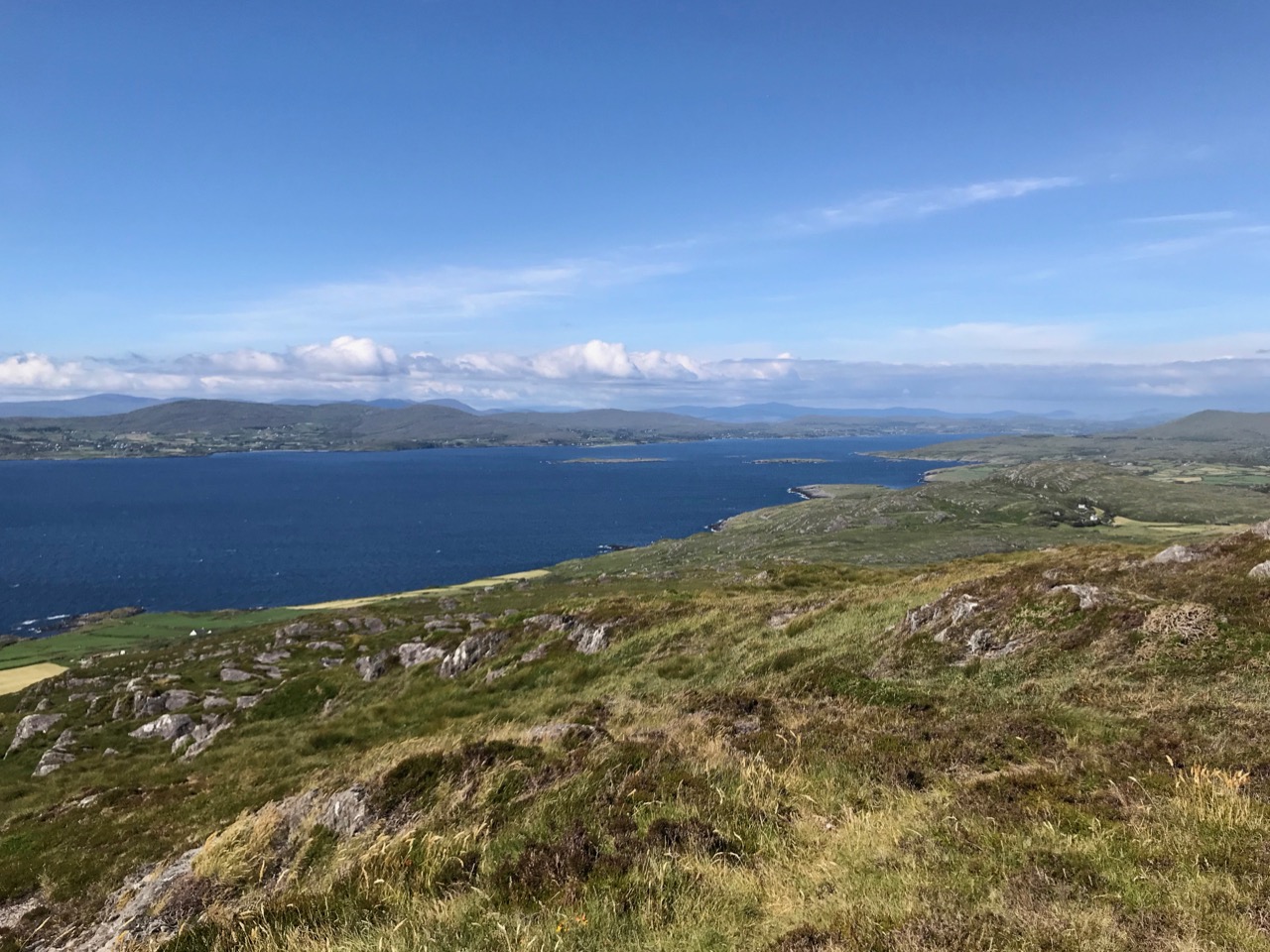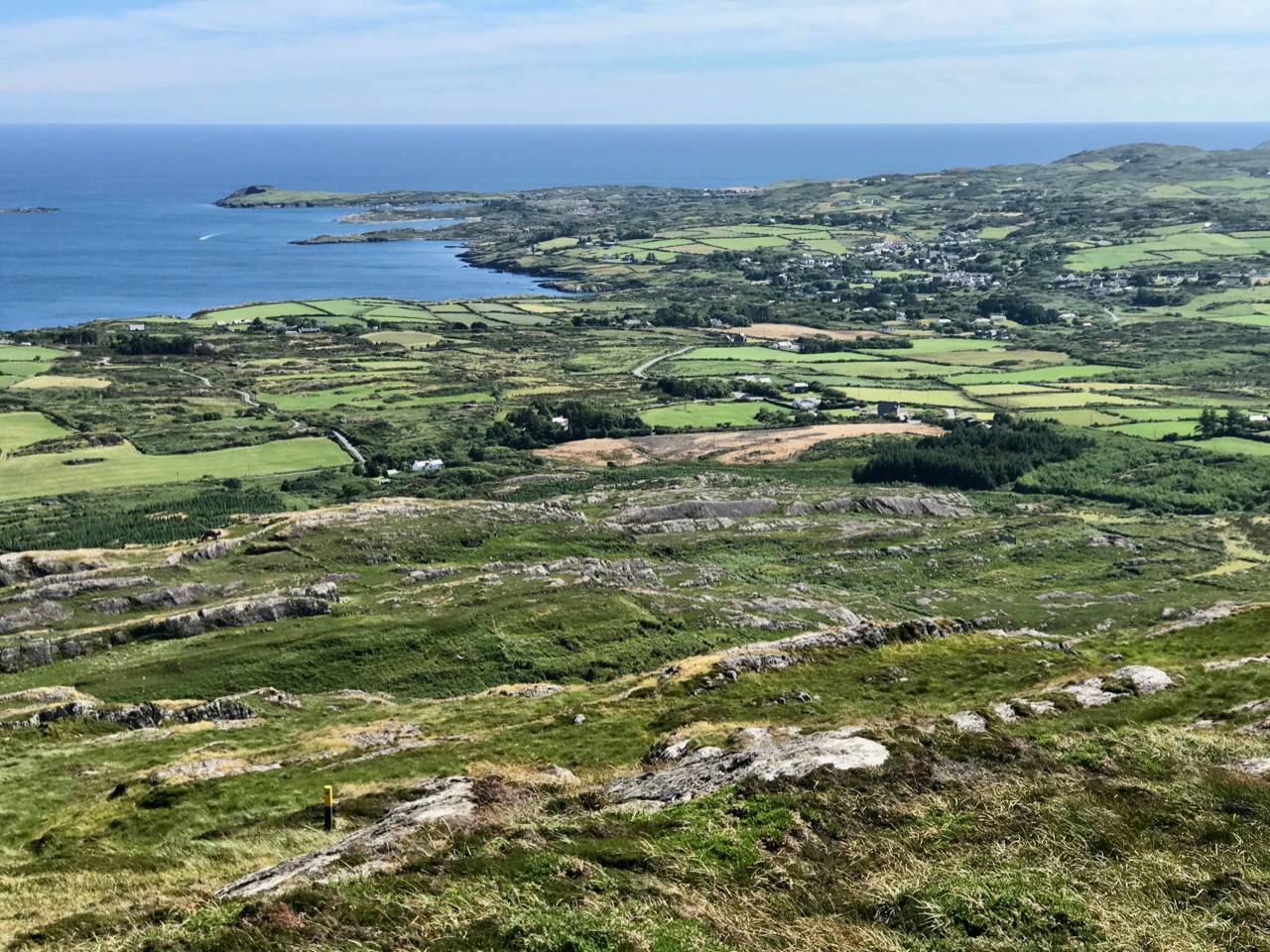 After a while the path turns to the east and follows narrow, grassy glens bordered by majestic, serpent-like outcrops. It’s here that the views begin to open out, particularly to the south. Always you think that there couldn’t be a finer prospect over the Mizen and across the islands of Roaringwater Bay, and always – as you climb higher – you are surprised by the next, which is even better.