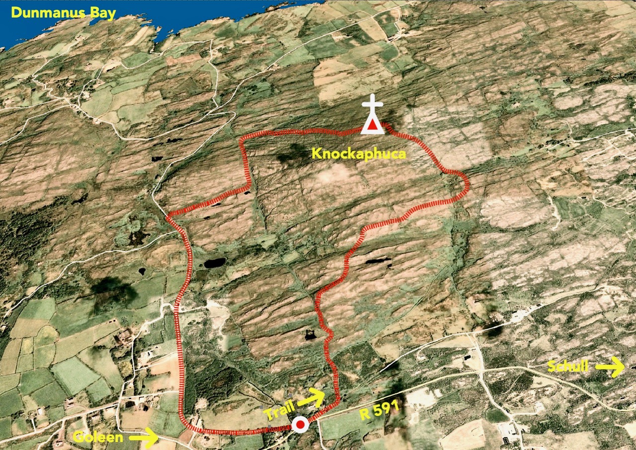 In fact the full Knockaphucka Loop trail starts in Goleen, and is 10km long. We joined it as it leaves the R591 road north of the village (upper picture – the route goes off to the left). The map above has the mountain section (which we followed) superimposed on the Google Earth contour information. The section we walked is 6.6km long, and climbs about 200 metres.