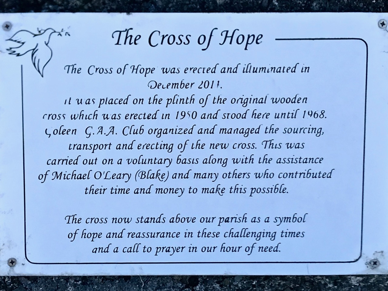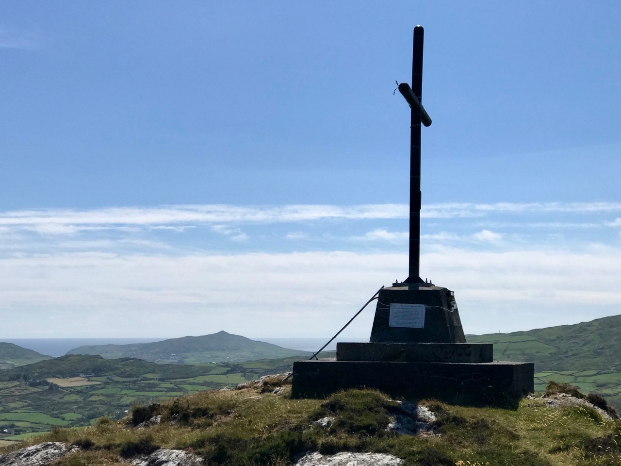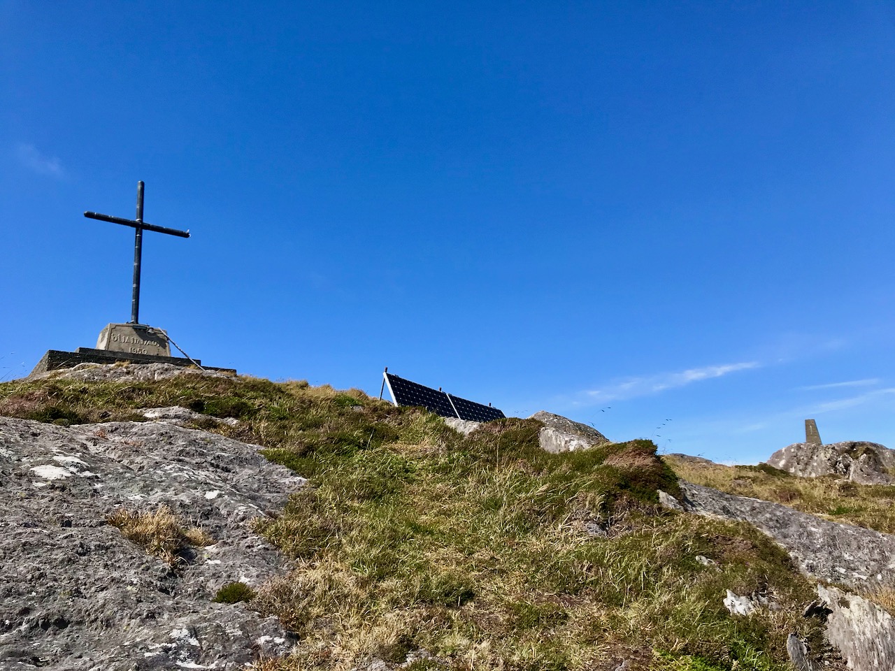 You won’t get lost as you head for the summit: this mountain had a distinctive cross placed at its highest point in the Holy Year of 1950, which reportedly fell in 1968, leaving the inscribed concrete plinth intact. The photo below shows the plinth in 2006 – courtesy Richard Webb. A new cross was installed in 2011 by a community effort led by the local GAA: this is now visible from much of the trail. The plaque mentions ‘…these challenging times…’, referring to the financial crash that hit Ireland so badly around that time. Illumination of the cross today is provided by photo-voltaic cells.
