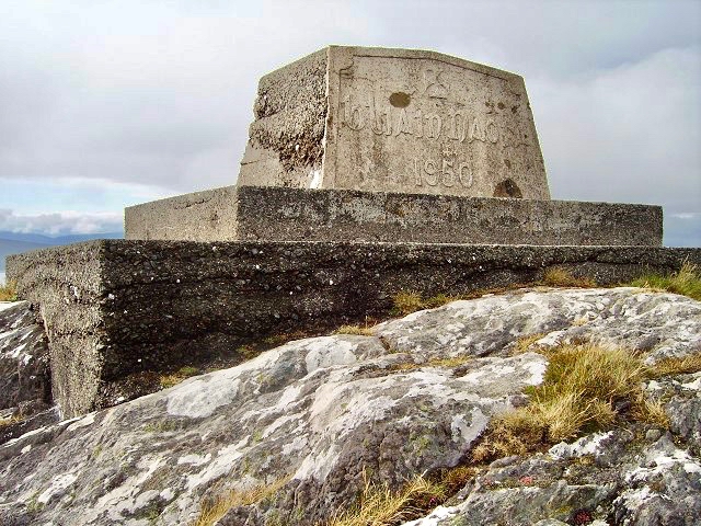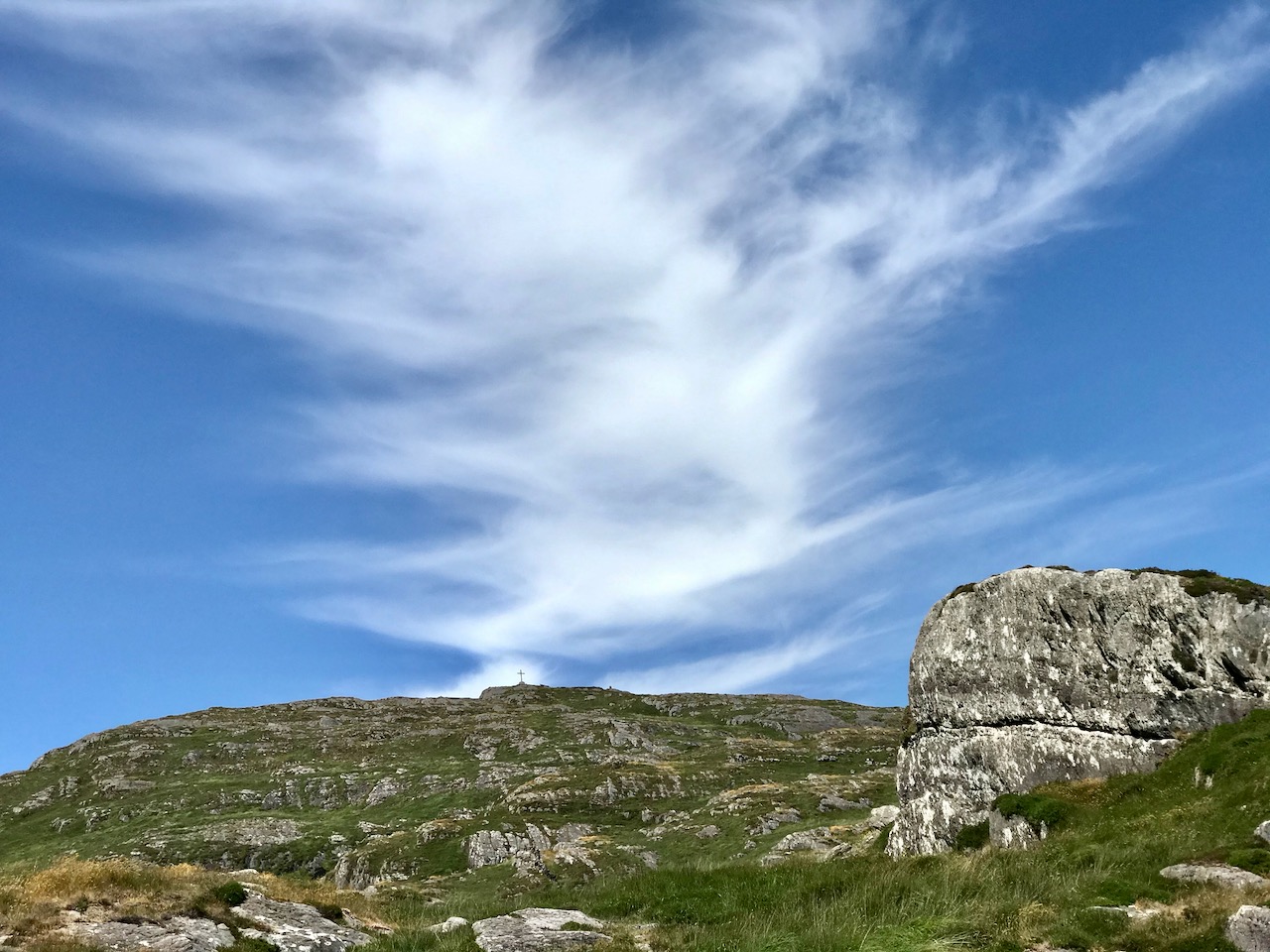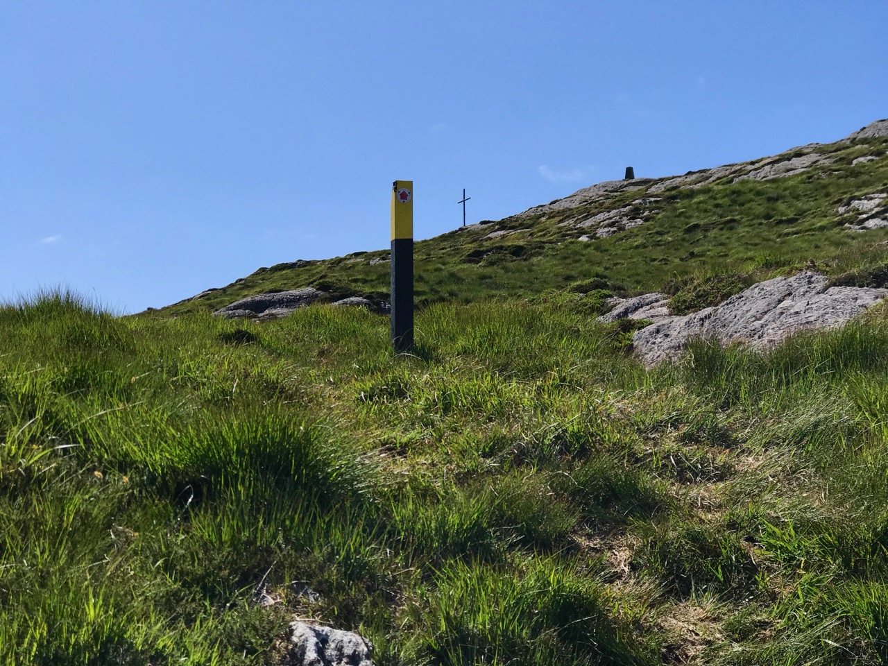 You won’t get lost as you head for the summit: this mountain had a distinctive cross placed at its highest point in the Holy Year of 1950, which reportedly fell in 1968, leaving the inscribed concrete plinth intact. The photo below shows the plinth in 2006 – courtesy Richard Webb. A new cross was installed in 2011 by a community effort led by the local GAA: this is now visible from much of the trail. The plaque mentions ‘…these challenging times…’, referring to the financial crash that hit Ireland so badly around that time. Illumination of the cross today is provided by photo-voltaic cells.