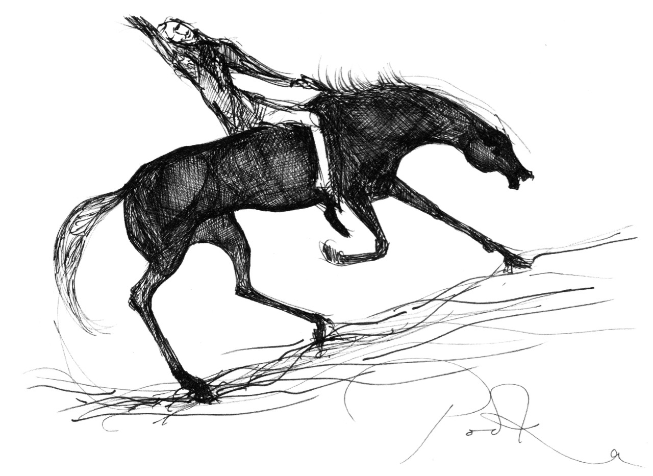 Thank you to our artist friend Hammond Journeaux of Ballydehob for this wonderful drawing of ‘Pooka’, included in The Little People of Ireland by Aine Connor, illustrated by Hammond, The Somerville Press, 2008. Púca in Ireland has counterparts in Cornwall (Bucca), Wales (Pwca), The Channel Islands (Pouque) and Brittany (Pouquelée). A shape-shifter (Flan O’Brien’s character from At Swim-Two-Birds, the Pooka MacPhellimey, changes his appearance by smoking from a magic pipe), the Púca most often appears in Ireland as a fine black stallion with red eyes. If you meet him, you have to mount him and he will take you on a journey far across the sea. It will seem to you as though you had been away for only a few hours, but the world will have moved on several weeks, perhaps months, during your absence. We saw no trace of the creature in June but, perhaps, if we climbed this mountain in the November Dark, we would have more chance of an encounter.