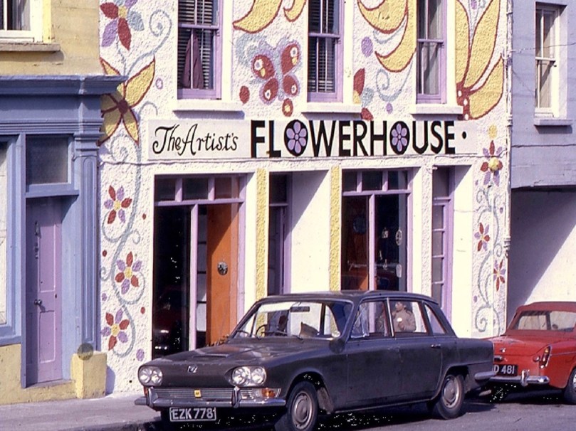 When I moved from Cornwall to West Cork some years ago I was delighted to find out that our lively adopted village of Ballydehob had a great artistic heritage during the second half of the twentieth century, to rival that of Britain’s westernmost county. West Cork became a cosmopolitan centre for artists, writers, craftspeople and musicians, renowned in its day but never properly celebrated – until this year. I was one of a small group locally who decide to rectify this by establishing the Ballydehob Arts Museum (BAM): our first exhibition . . . Bohemians in Ballydehob . . . using donated artworks, ceramics, storyboards and posters, was staged in Ballydehob’s community building, Bank House, and – presided over by Curator Brian Lalor (one of the surviving Bohemians!) – was the first incarnation of the new Museum, which will be followed up by new exhibitions every year. The picture above (courtesy of Andrew Street) from my post, shows the Flower House which, during the 1960s and 70s, became an iconic focus for the town’s artistic colony.