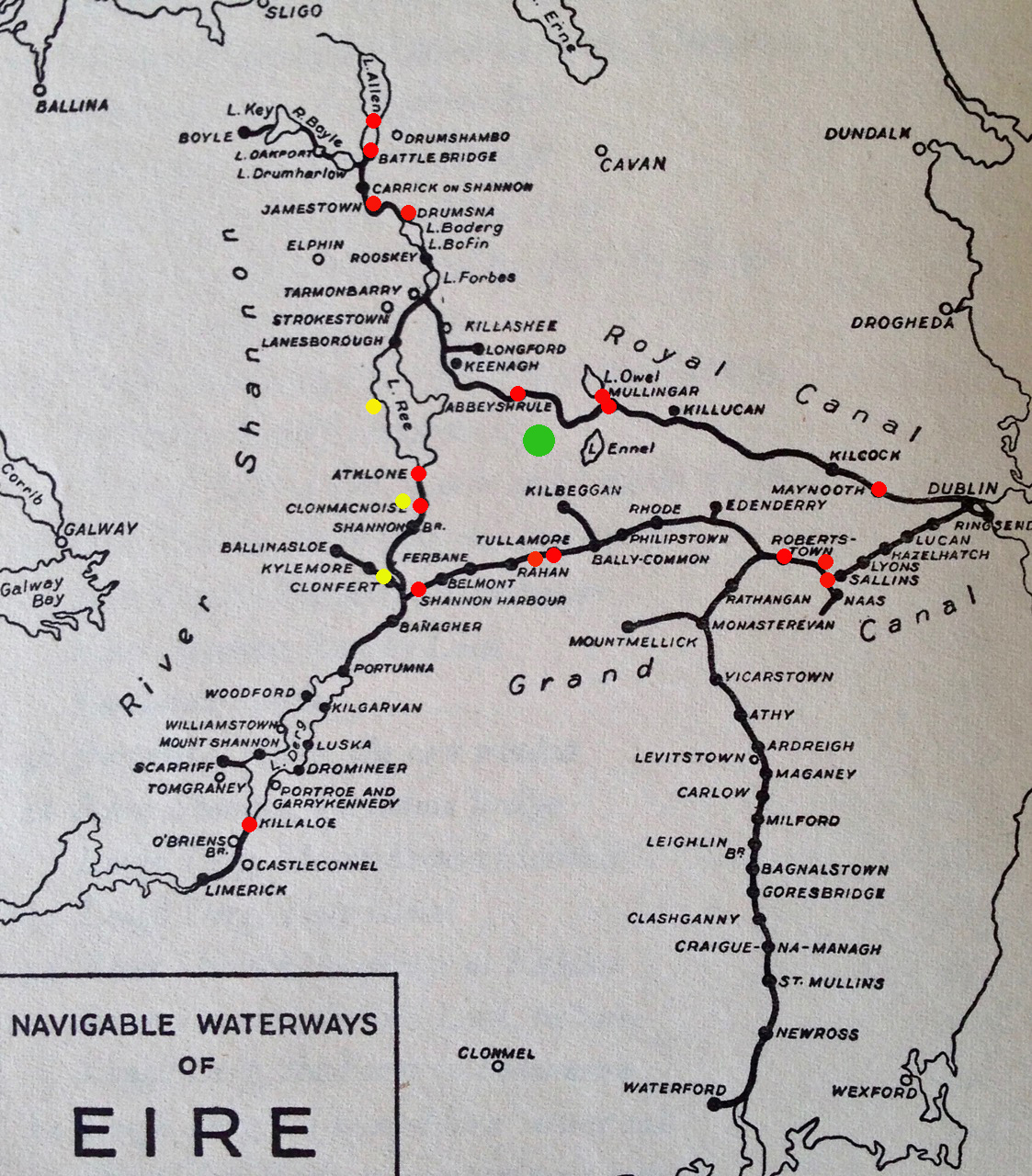 The Shannon Navigation is now managed by the cross border authority Waterways Ireland. This body also manages the navigable canals, rivers and lakes throughout the island of Ireland, and does a very good job of it. Such an undertaking would probably have never been foreseen by the Rolts 70 years ago when some of the canals had been derelict for many years, and others were in poor condition. The Rolts’ borrowed boat Le Coq was based in Athlone and was probably the last craft to fully circumnavigate the circular route encompassing the Royal Canal, the Shannon and the Grand Canal in the 20th century: the Royal Canal fell into disuse shortly after the Rolts’ journey and was formally closed in 1961. Today the Royal Canal is completely restored to navigation (it was reopened in 2010).