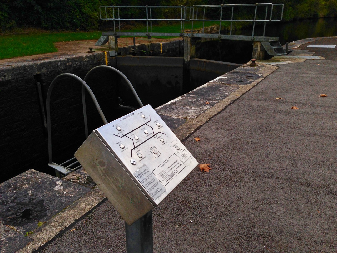Upper picture – Athlone Lock today – some of the original Victorian lock machinery has been retained and is in working order although the main operations are electrically powered. Middle picture – upstream of Athlone the river widens dramatically as it approaches Lough Ree. Lower pictures – distinctive livery of the lock machinery in Athlone: note the commemoration of Thomas Rhodes, the engineer of the navigation improvements