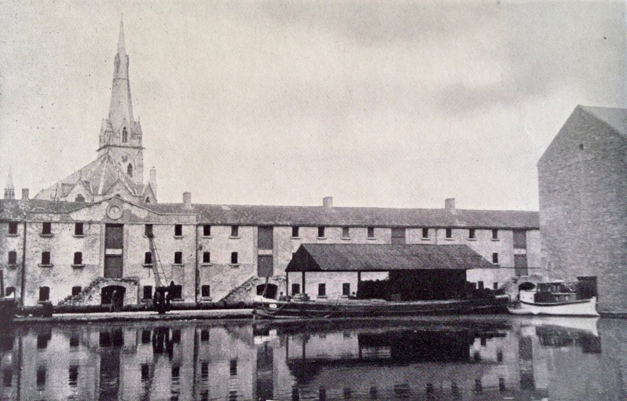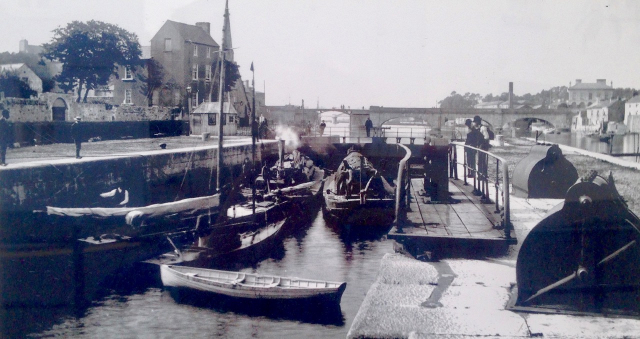 Upper picture – probably early 20th century – the lock at Athlone: note the commercial craft in the lock, one of them a steamer, and the lifting span on the bridge in the distance. Lower picture – Fry Place, Athlone, courtesy of The Leftbank Bistro: this probably dates from the late Victorian period and shows O’Ferrall’s on the left (see above) and a matching shopfront to the right