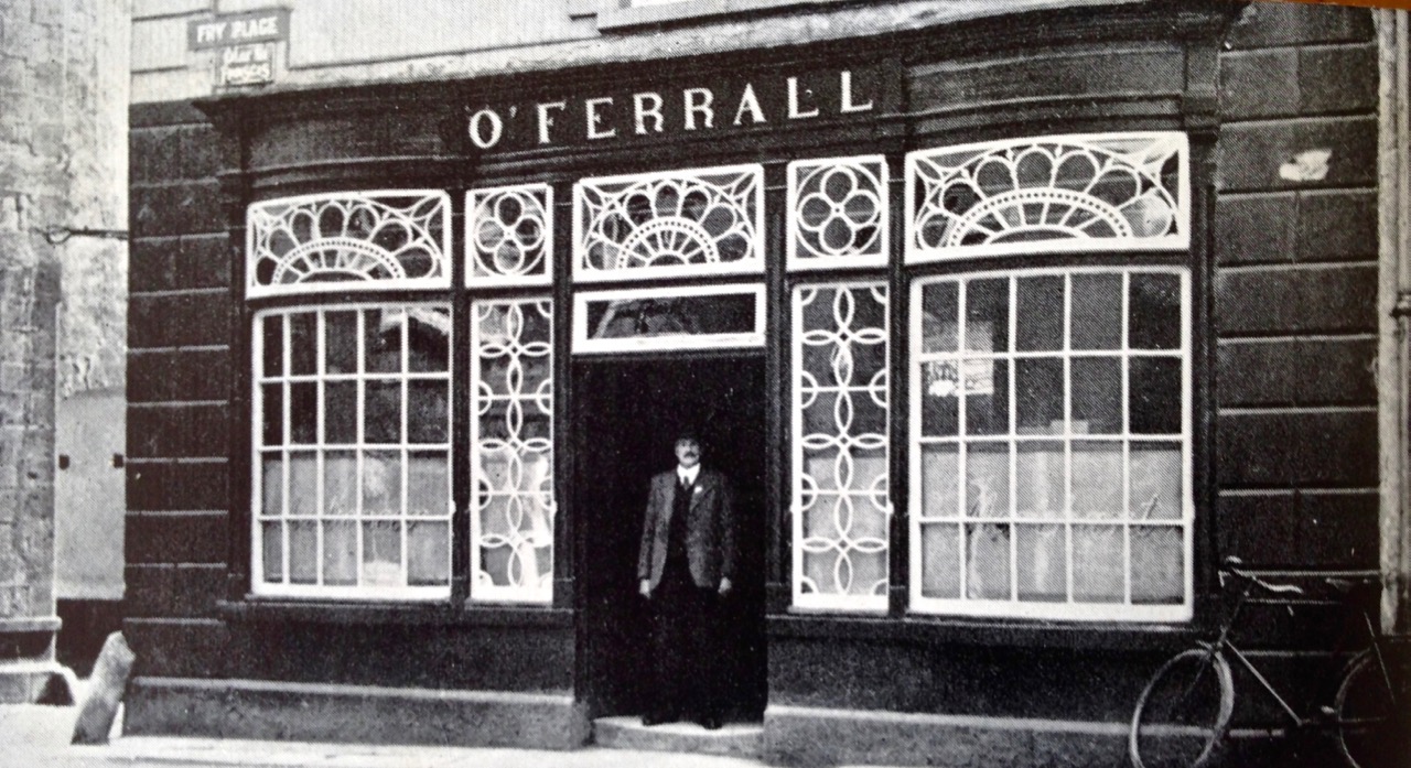 …One of the shops we visited was O’Ferrall’s, whose frontage dates from the days when shop-fitting was not merely a business but an art, as the picture we took of it, with ‘himself’ in the doorway, clearly reveals. Old Mr O’Ferrall was a tall gaunt figure. His hawk-like features had an aristocratic cast which was somehow enhanced by a long coat of archaic cut and a high stand-up collar. He had, we discovered, a great sense of the past, and as we sat together in the confined space of the small wooden cubicle to which, as in most Irish bars, women must retire in order to drink with propriety, he talked of the history of Athlone. Like that of most Irish towns, it has been stormy… (Green & Silver L T C Rolt 1946)