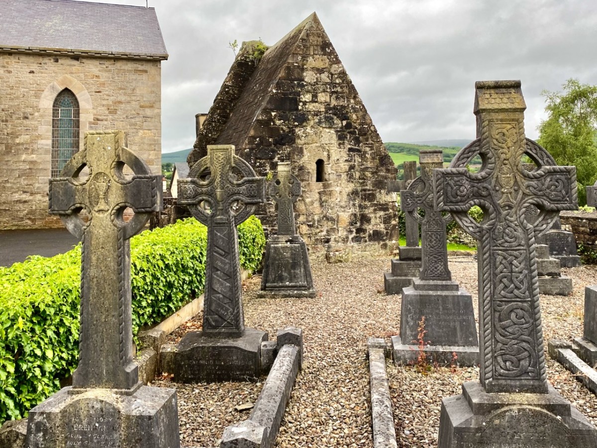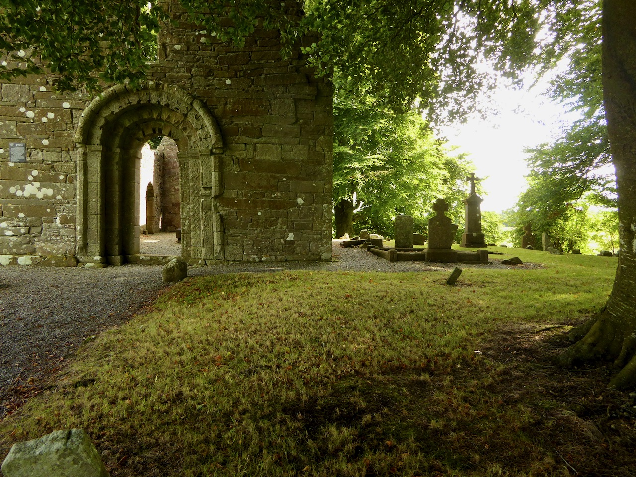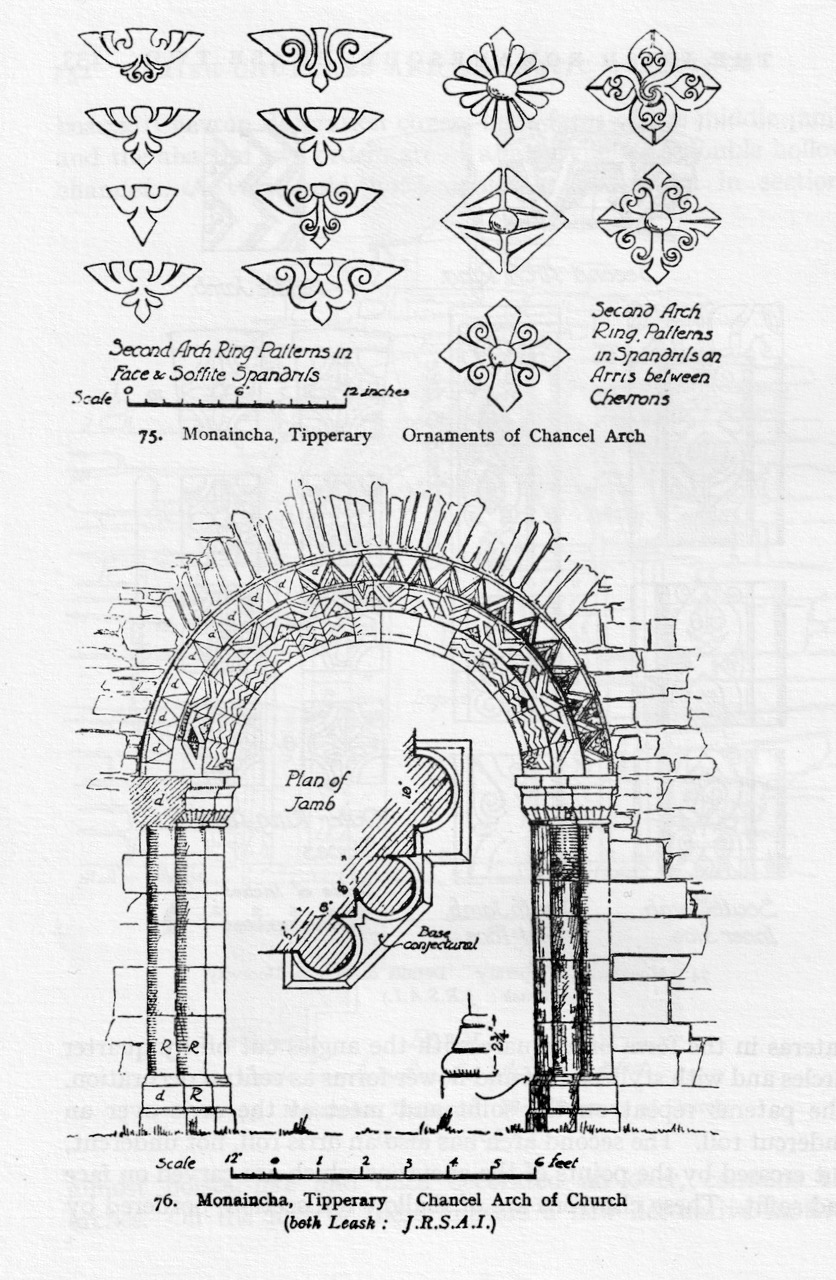 In this photograph of the Oratory as it stands today in the church grounds at Killaloe, it is perhaps worth wryly commenting that we see a true piece of early medieval architecture behind the screen of ‘pseudo’ high crosses. We have a good record of how the remains were dismantled and accurately re-assembled: this was written by the archaeologist H G Leask MRIA in 1930: