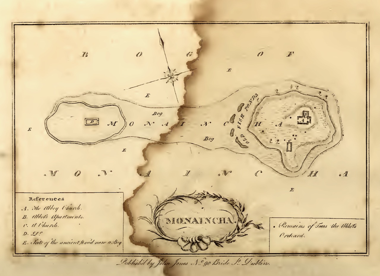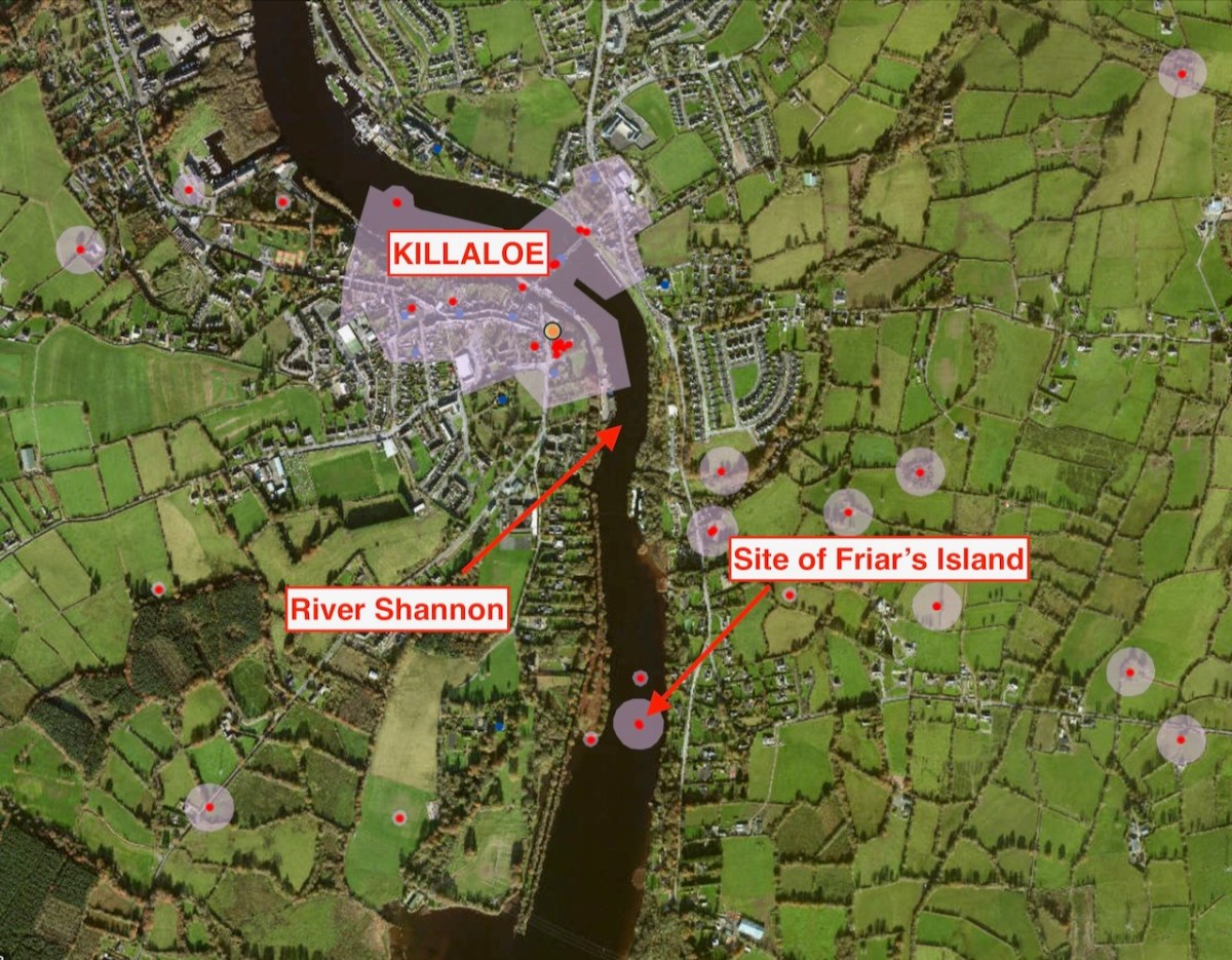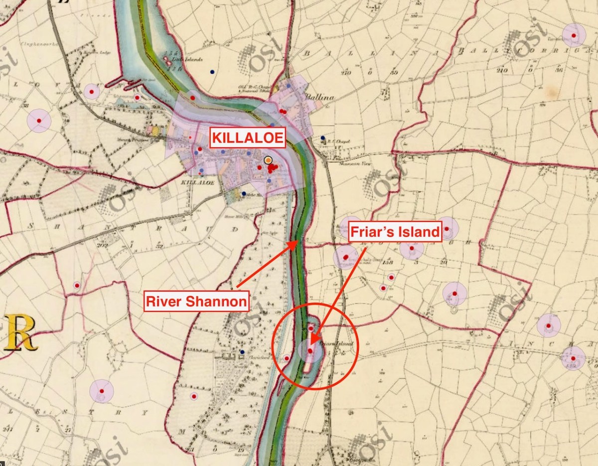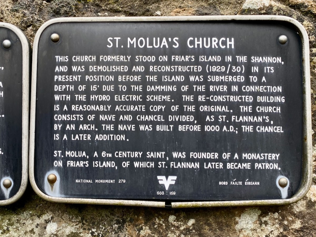 The aerial view, above, shows the river today with its elevated water level. In the pic you can see the ‘Site of Friar’s Island’ indicated: before 1930 there was an island there, on which were some noted relics, including the Oratory of St Molua of Kyle (also known as St Lua), who died in the year 608. His feast is celebrated on August 4th. It’s said that crowds used to assemble there on that day, most of them wading across the water to get to the island. This description of the saint is from the Schools Folklore Collection (informant Tom Seymour, aged 60, Cloncully Co Laois):