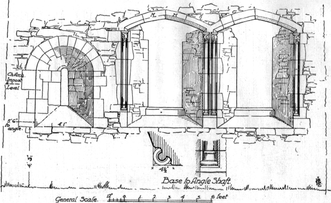 . . . In order that the rebuilding should be, as far as was possible, an accurate one, it was necessary to adopt a system of marking the stonework by which the original stones should occupy their original positions when reassemble. The stones being very varied in size and irregular in shape, and laid uncured, no system of numbering such as could easily be applied to squared ashlar was admissible. To the Clerk of Works in charge, Mr C J Dowdall, must be given the credit for the scheme finally decided upon. This consisted in marking with paint of different colours a series of level lines at two feet vertical intervals all round the exterior and interior wall faces. These lines were crossed again by a series of vertical lines at the same intervals but of one distinctive colour for each wall face inside and out. Where the squares formed by this grid of paint enclosed, unmarked, a number of small stones, diagonal lines were added to each square to ensure that every stone showed the same marking. A complete series of elevational photographs of each wall face was taken and careful drawings were also made with the coloured guide lines indicated upon them. On the large plot of ground on the opposite side of the river kindly lent by Major Lefroy, above future water level, timber guide planks were laid down as a frame to each wall and gable face. On the timber frames the coloured guide lines were indicated and the stones when transported were laid down face upwards, in sand, in correct relation with the coloured marks. Each wall, of course, was divided in two vertically along its length and “displayed”. Important quoin, jamb, and arch stones were numbered in colour in regular order. The transport over the Shannon was carried out by means of a specially built barge and a rope stretched from shore to shore, the workmen simply “handing” the boat across by this means. An inclined trackway with truck and winch was erected by Messrs Siemens Bau Union and two small temporary jetties by direct labour. The Most Reverend Dr Fogarty, Bishop of Killaloe, vested a site in the Church enclosure on the summit of the hill in Killaloe town, and the building has been erected there and is now (May, 1930) approaching completion. (Note: the work of re-erection was finally completed in July, 1930) . . .
