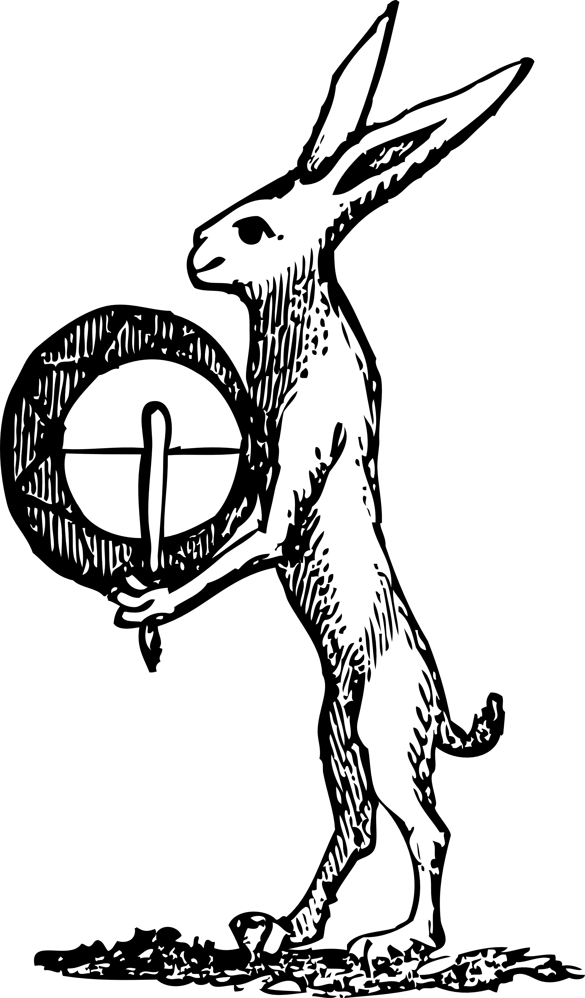. . . the hare is a principal actor and unique in these books in her animosity towards the hunter/tailor who would kill her for her pelt to line hoods and cloaks. A number of marginal scenes revolves around the subject of the hare exacting revenge on the hunter and these could be described as the hunter hunted or the world upside down. The hare is also shown fighting with her old adversary, the hound, using shield and sword, or defending a castle against him and his troops. In one instance, the hare triumphs and bears him home, presumably to eat . . .
