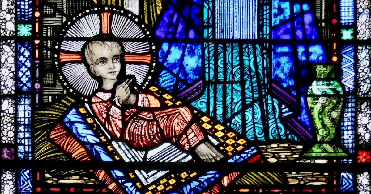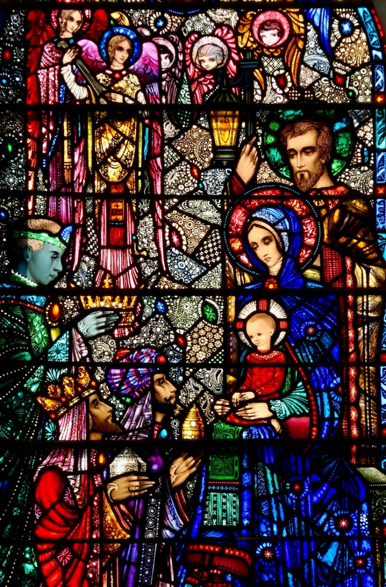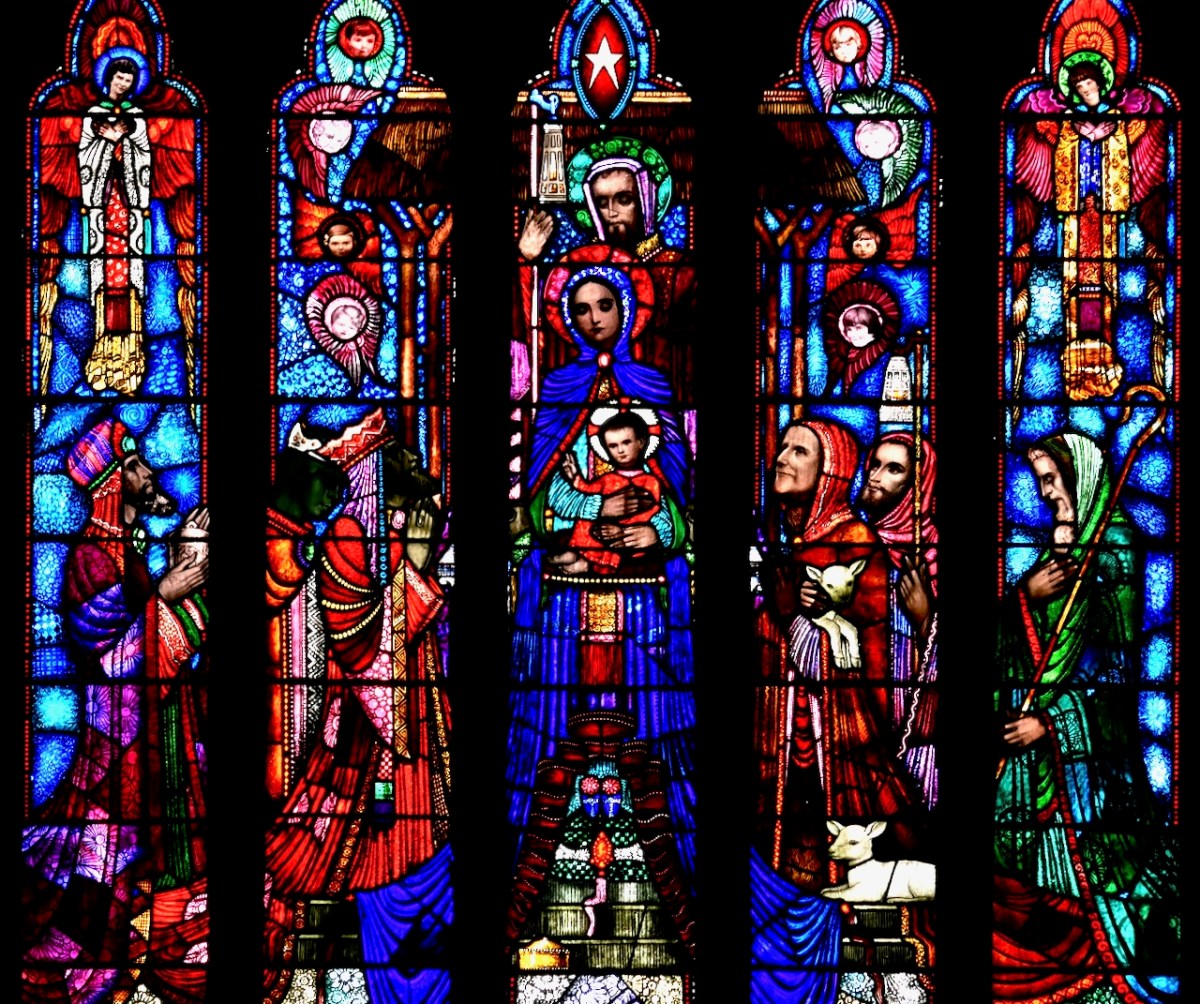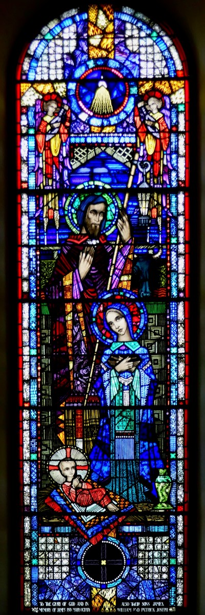 I will start with the place that launched Harry’s career, the Honan Chapel at University College Cork (I’ll finish with the one that is on my lead photo). And in fact it is his first windows for that Chapel – a three light, depicting Brigid, Patrick and Columcille, our three Patron Saints. This window is over the entrance, facing west, which, with Harry’s preference for dark colours and some internal lighting issues in the chapel, makes it hard to photograph.