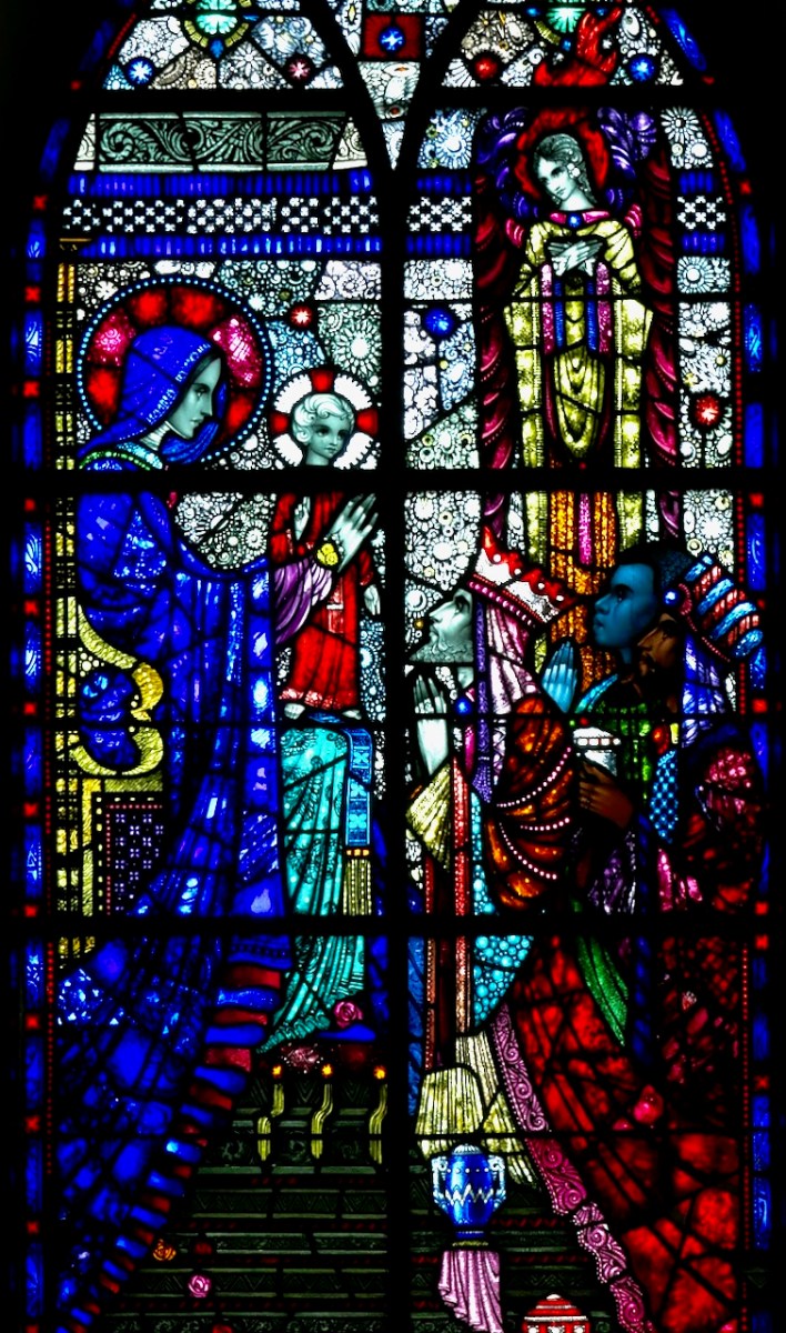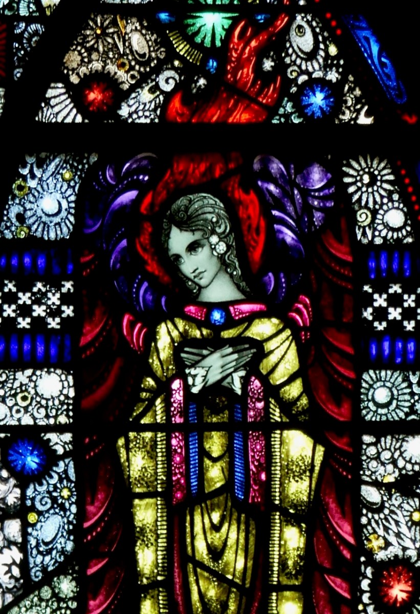 Harry had completed a detailed sketch design for this window in 1914 (Nicole Gordon Bowe has an image of that design in her magnificent The Life and Work of Harry Clarke) and the window was made in 1915. There are a few differences between the sketch design and the finished window, but on the whole, the window is true to Harry’s original vision for it. His notes for the window refer to