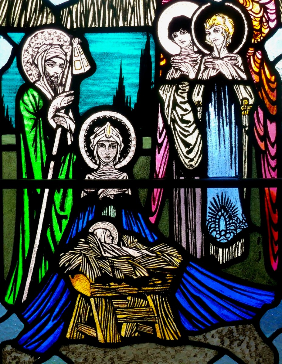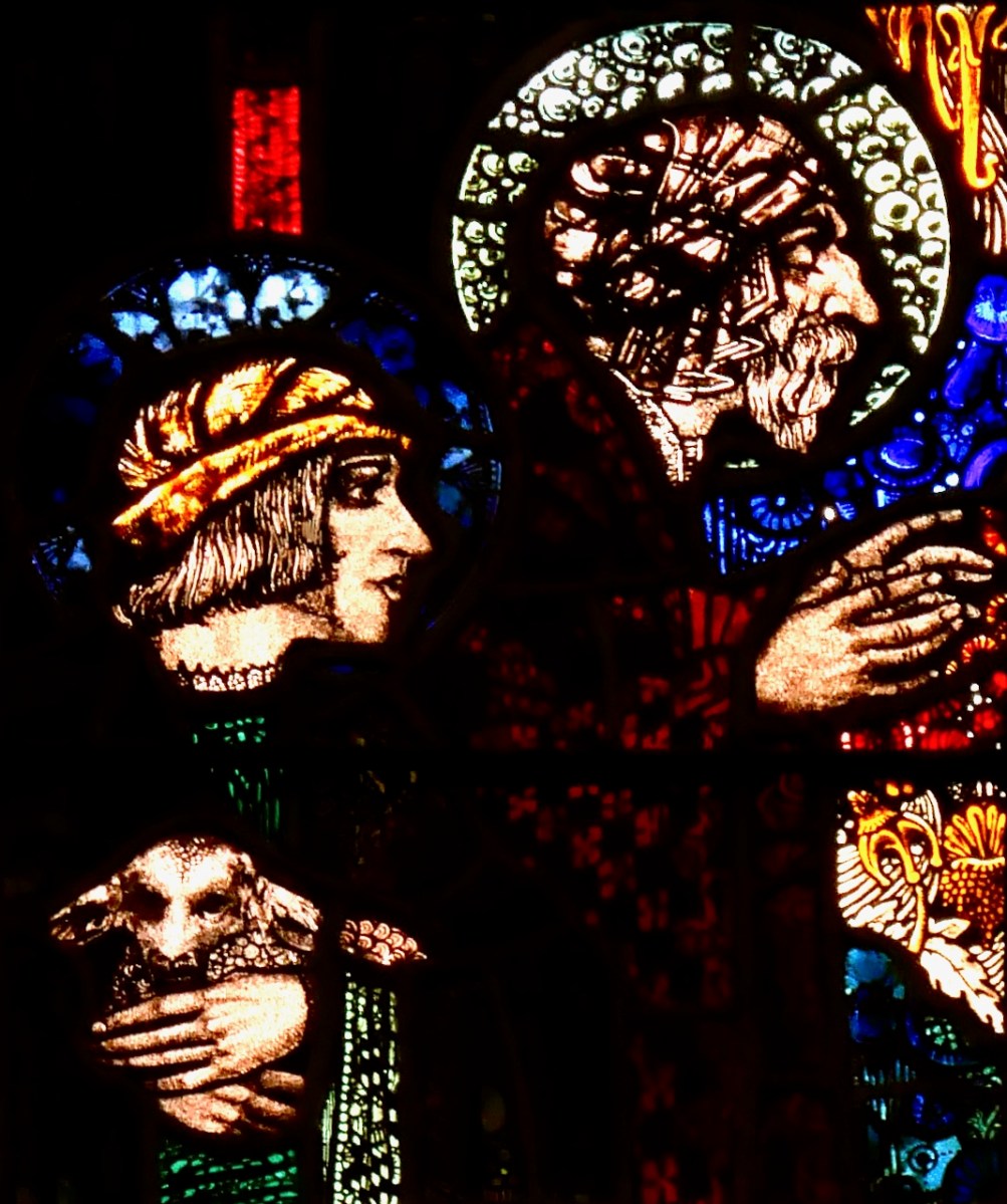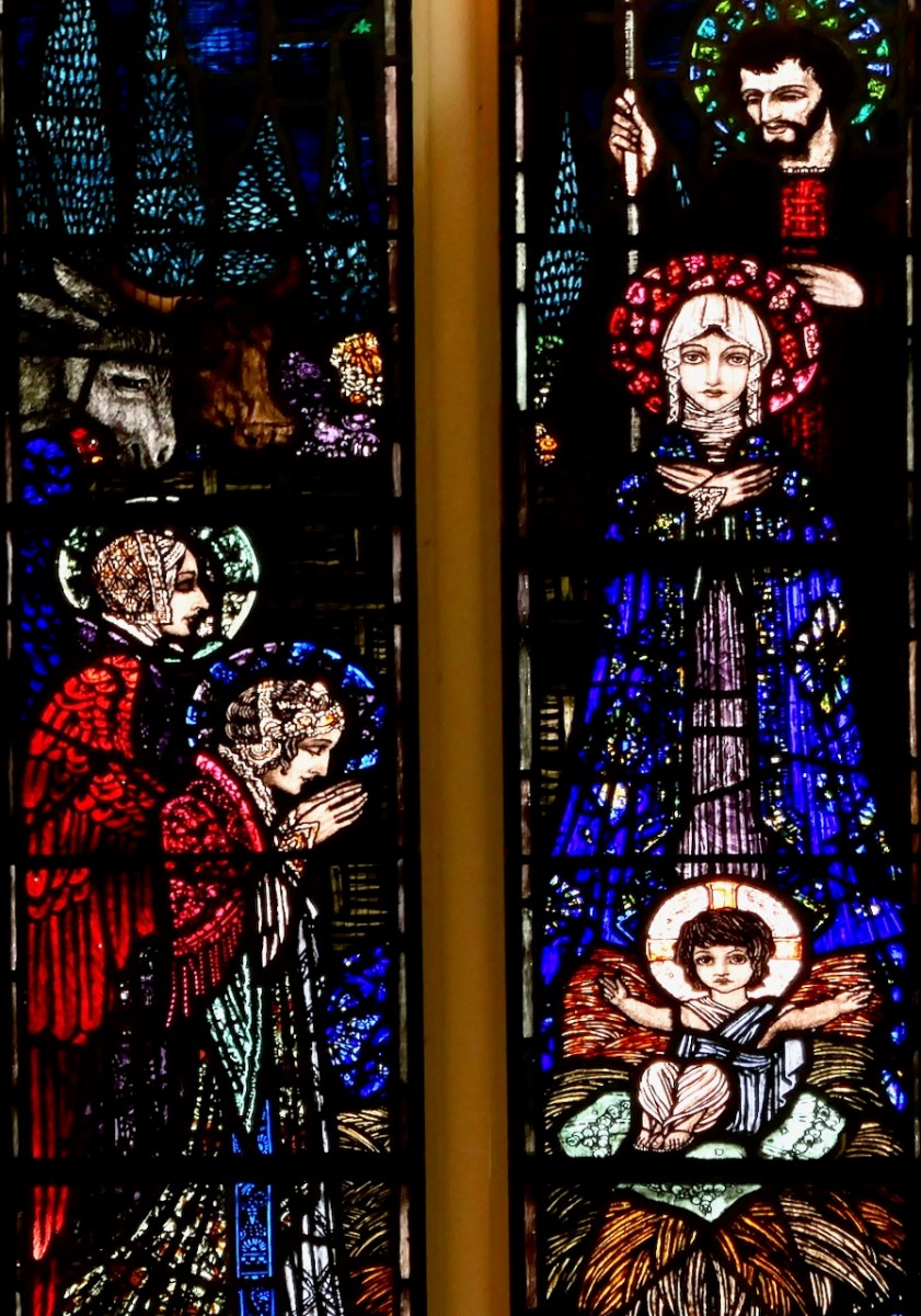 His next Brigid (above) was for the Nativity window in Castletownsend – I have written about that window extensively here so pop over and have a browse if you fancy. The Castletownsend Brigid, done in 1918, looks quite similar to the Honan Brigid and has the same oak leaf entwined in her fingers. The difference is that she is carrying the sacred lamp, has the Harry Clarke fingers, and is spelled S Bridget – the English version rather than the Irish Naomh Brighid of the Honan. [For non-Irish speaking readers – the small dot on top of consonants in Irish is now normally rendered as H – as in Briġid is now Brighid.]
